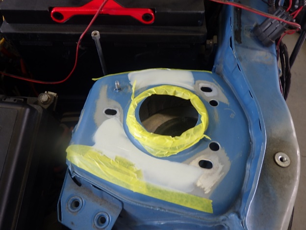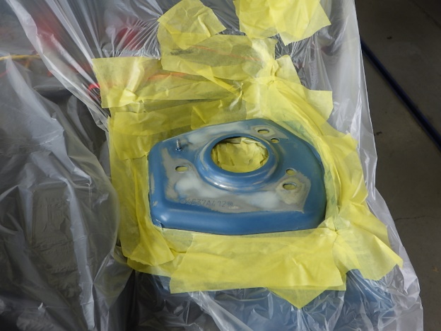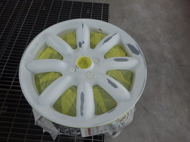 パテ乾燥の後、サンディング作業、マスキング作業、脱脂作業、エアブローを行い、