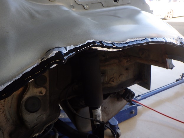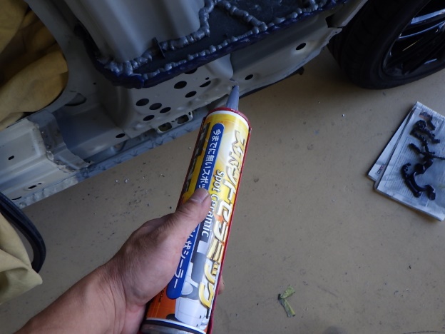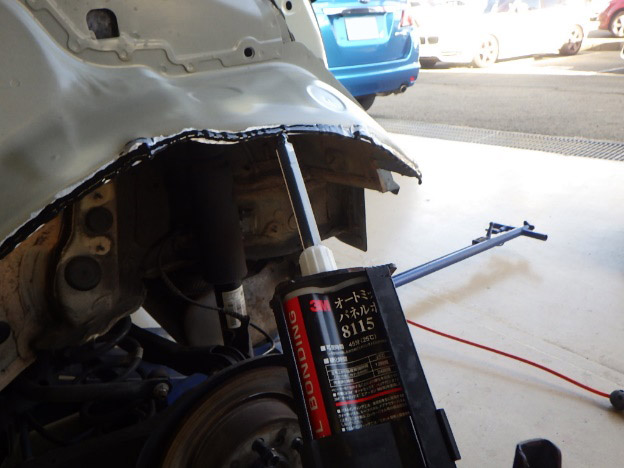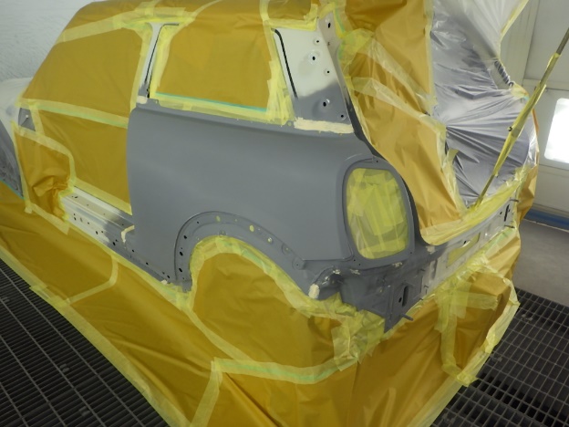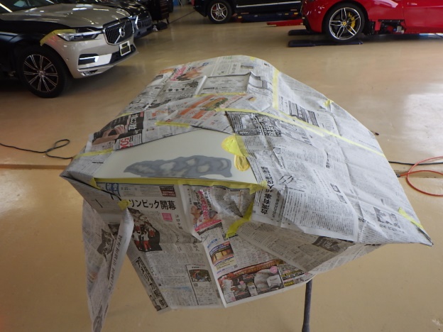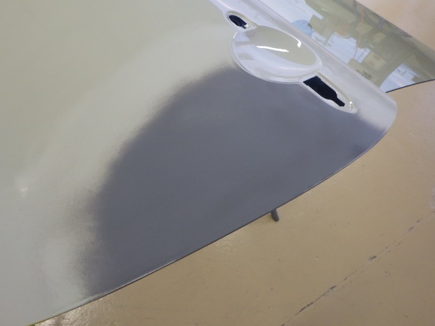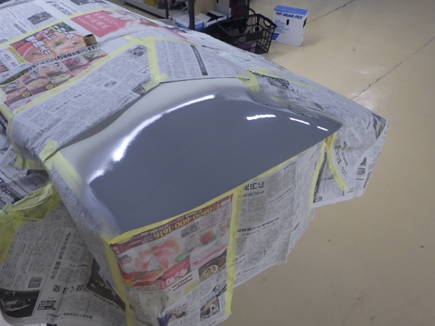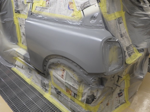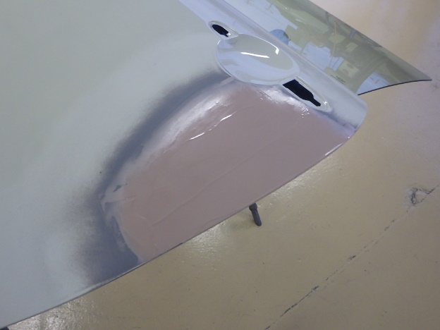 プライマー乾燥の後、足付け作業、脱脂作業、エアブローを行い、パテ付け作業を行いました。