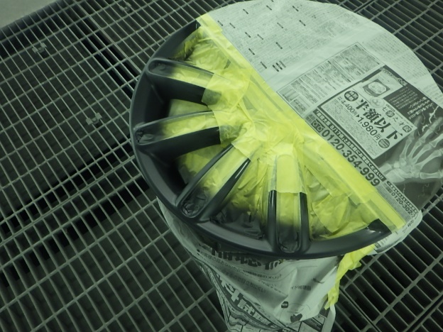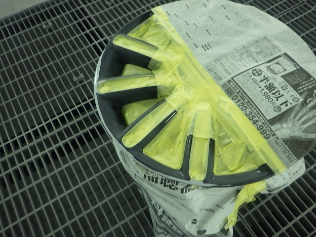 サフェーサー乾燥の後、足付け作業、マスキング作業、脱脂作業、エアブローを行い、