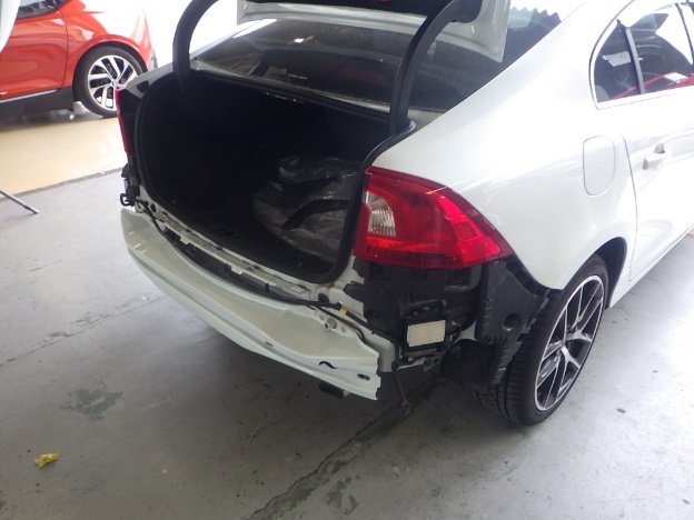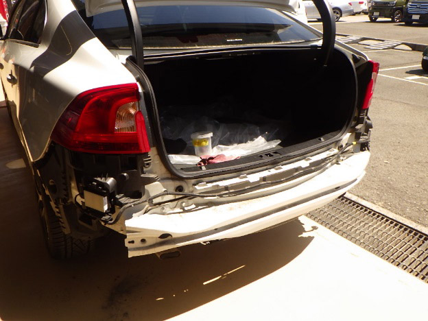 【鈑金塗装】【事故】兵庫県加東市、A様、2015y、ボルボ、S60、リアバンパー損傷へこみ修理レポートです!ありがとうございました。