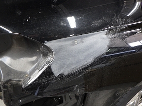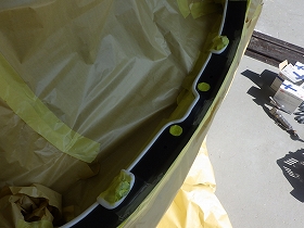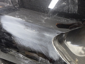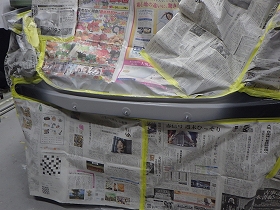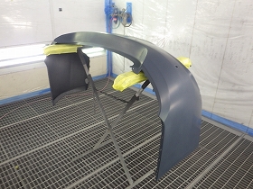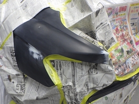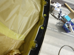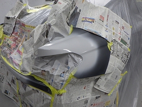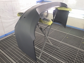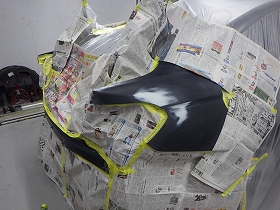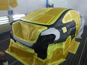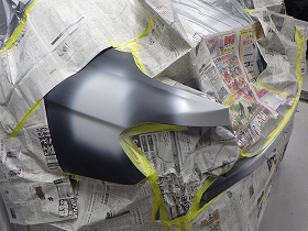 パテ修正作業の後、塗装準備(足付け、マスキング、脱脂、エアブロー)を行い、