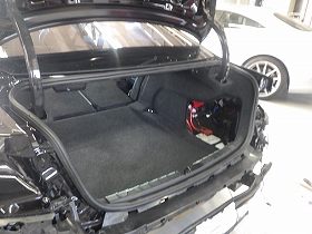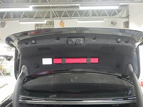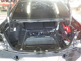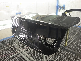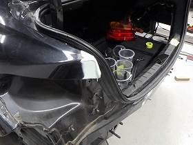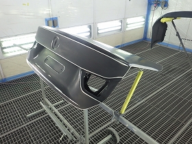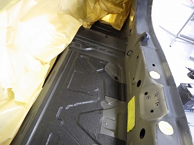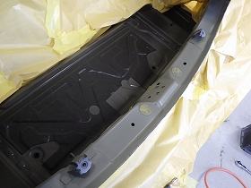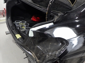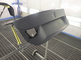 乾燥後、トランクルームのパテ修正作業を行い、塗装準備(足付け、マスキング、脱脂、エアブロー)を行い、サフェーサーの塗布作業を行いました。