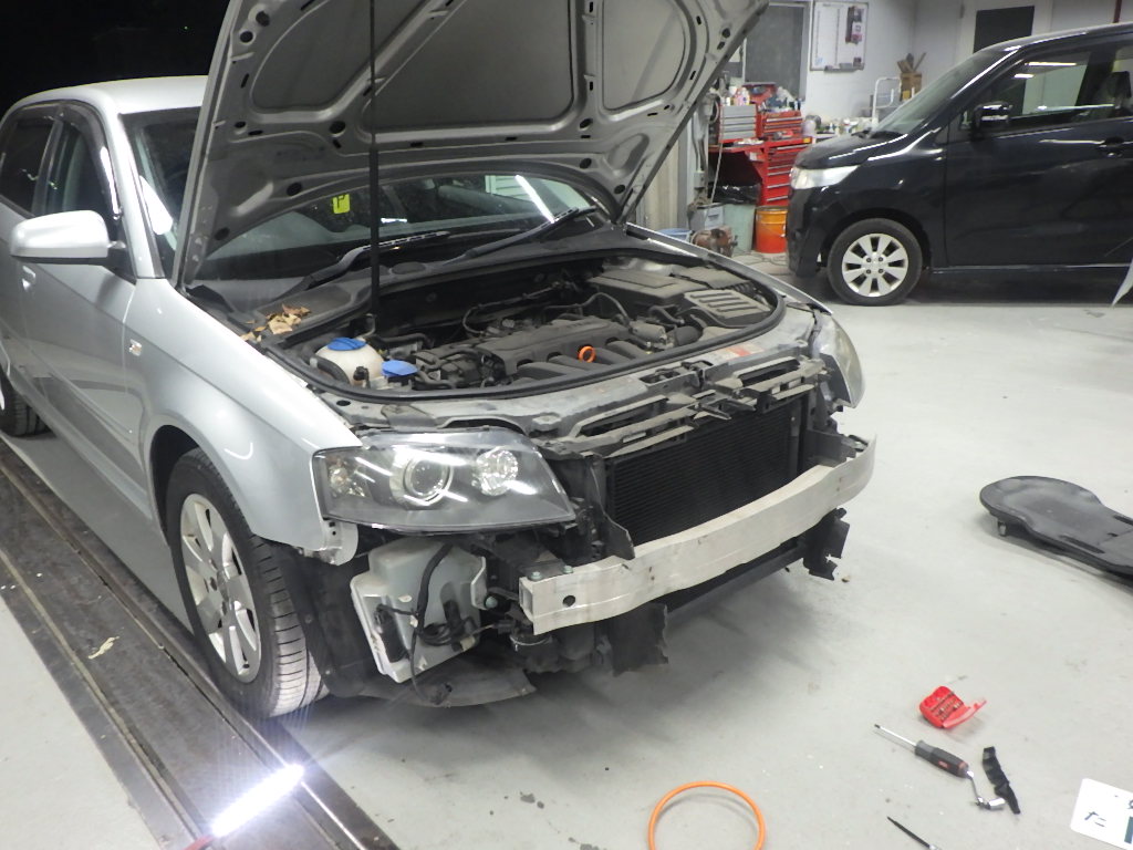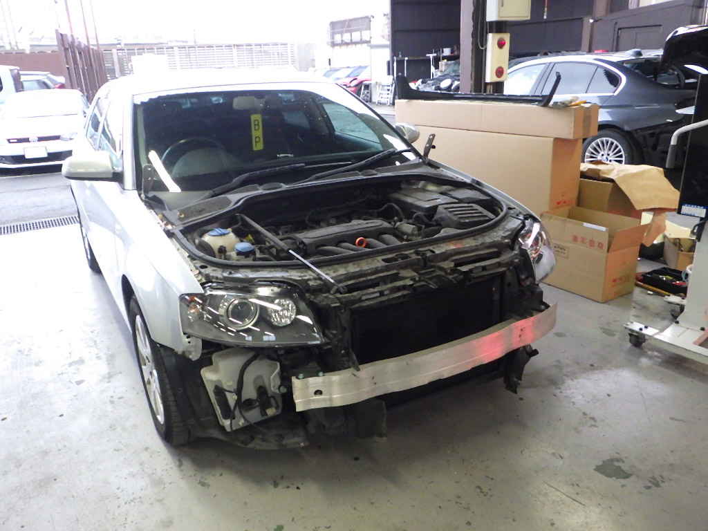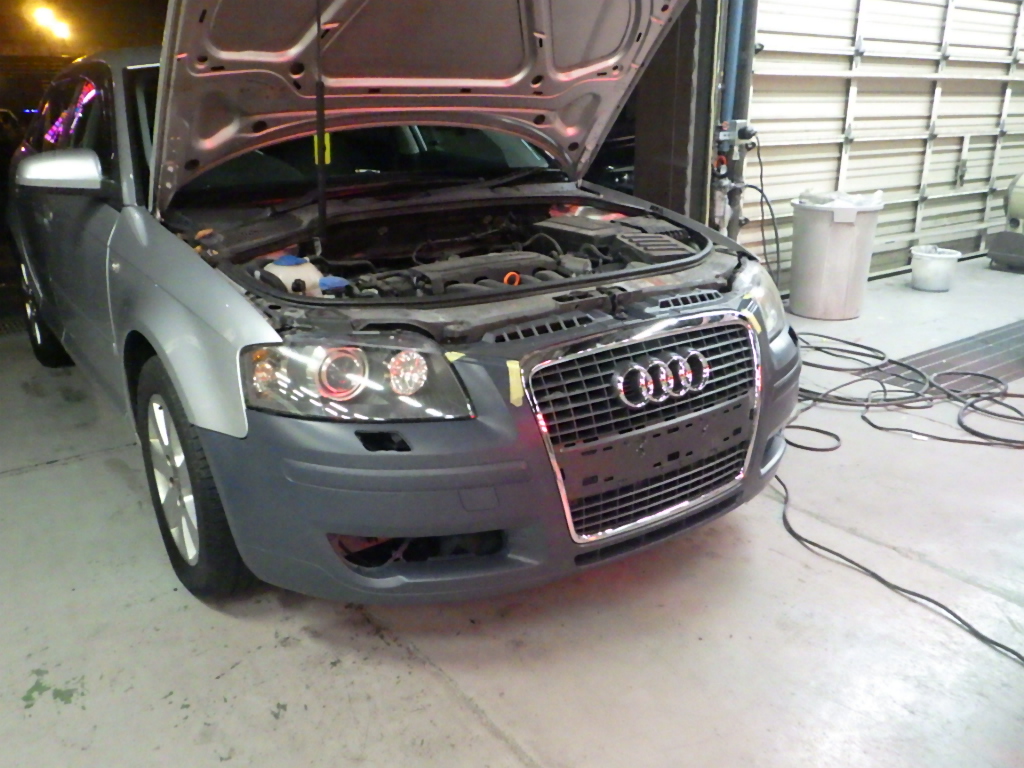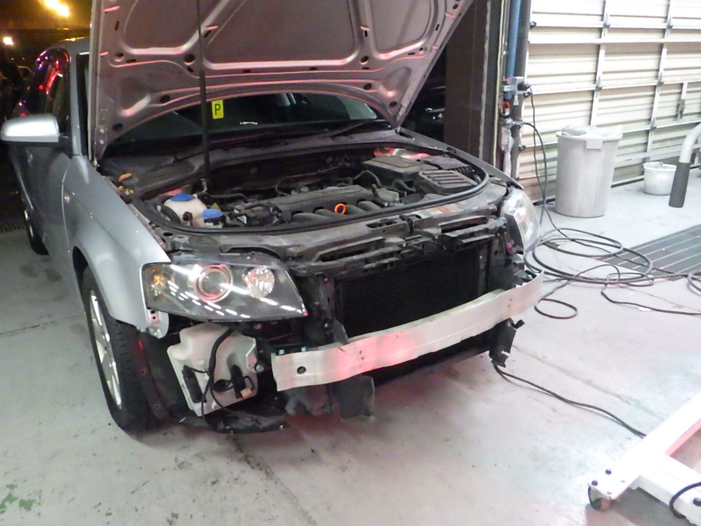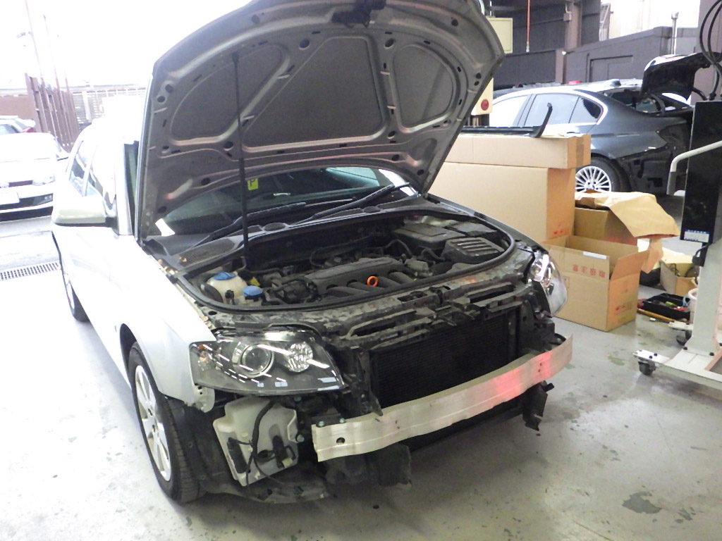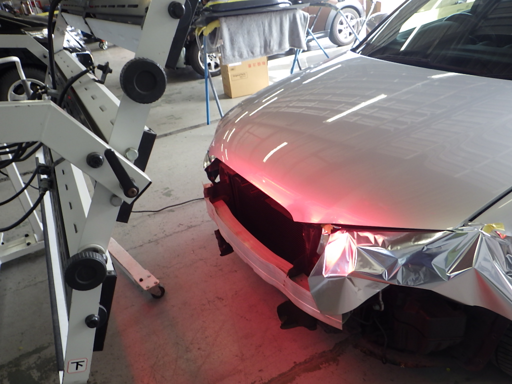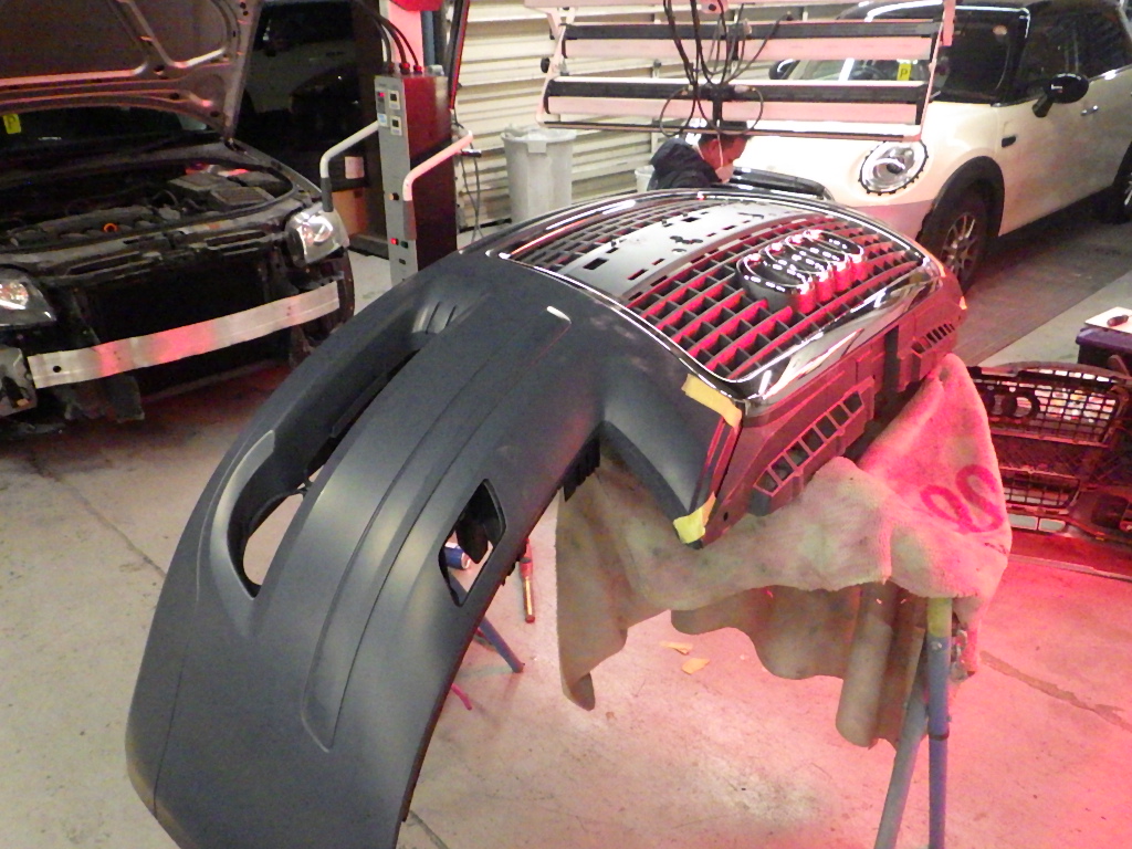 分解作業の後、新品バンパーの組立作業を行い、仮合わせ作業を行いました。