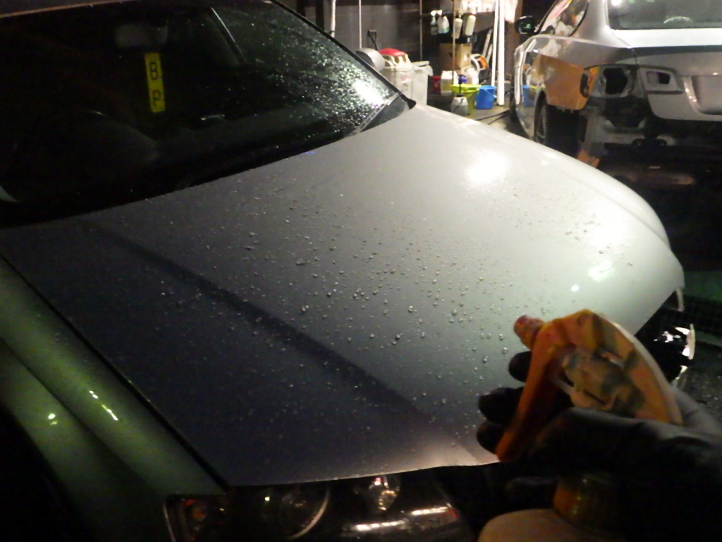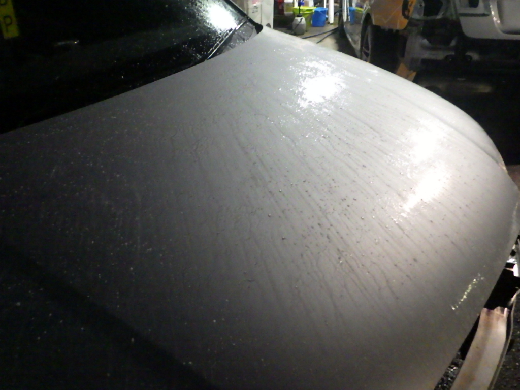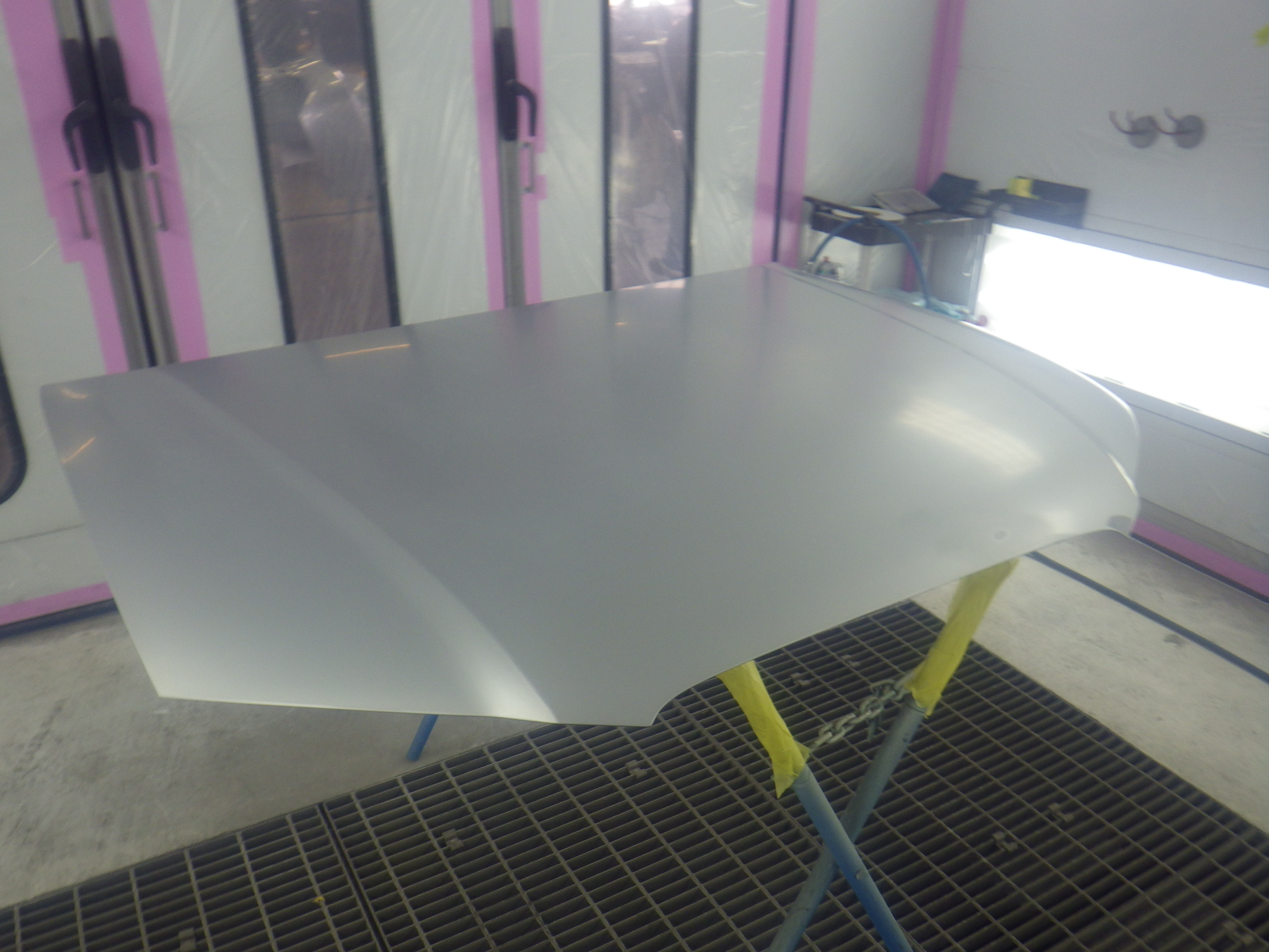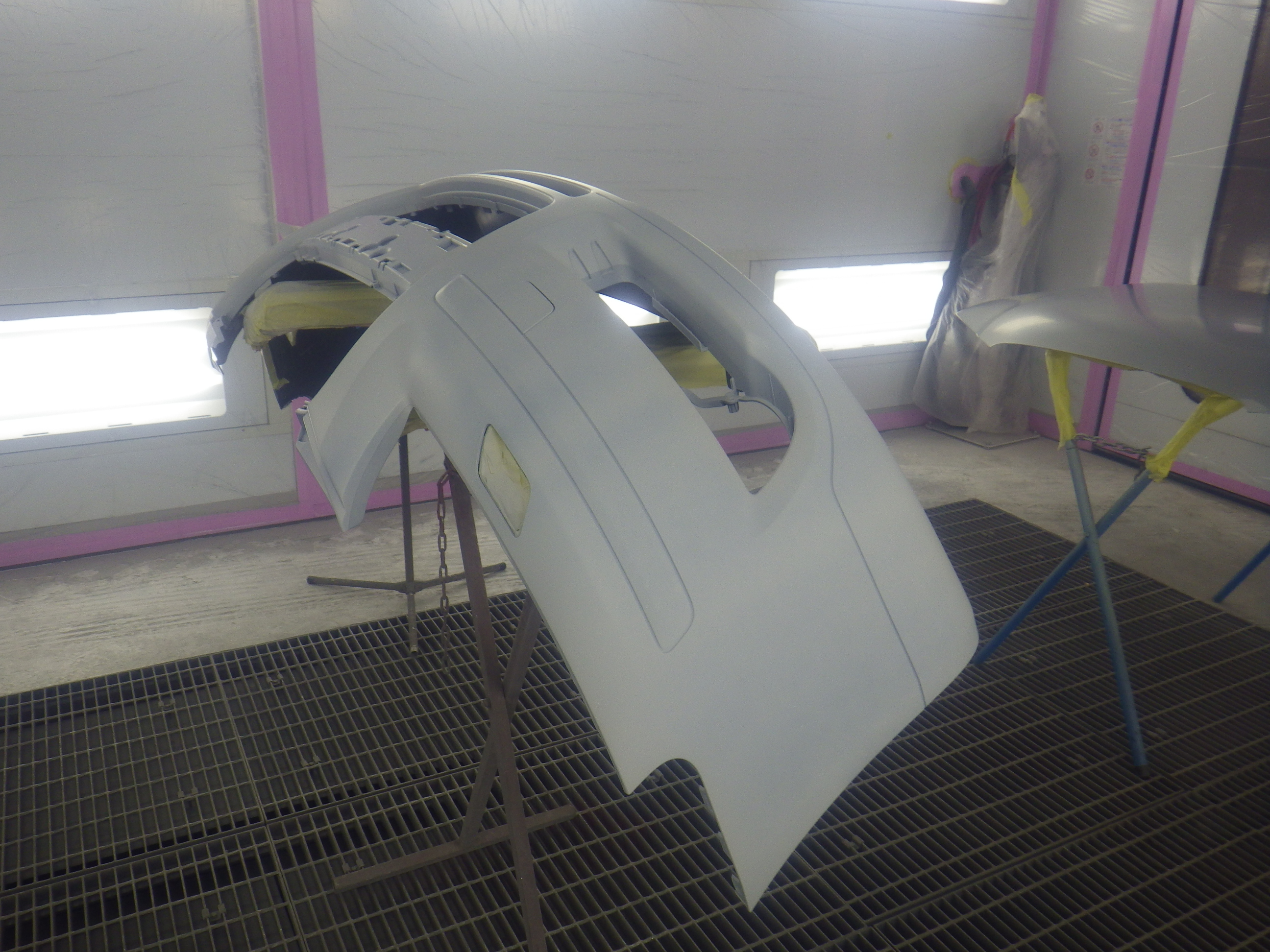 鉄粉除去作業の後、キズ修正作業を行い、塗装準備(足付け、マスキング、脱脂、エアブロー)を行い、サフェーサーの塗布作業をおこないました。