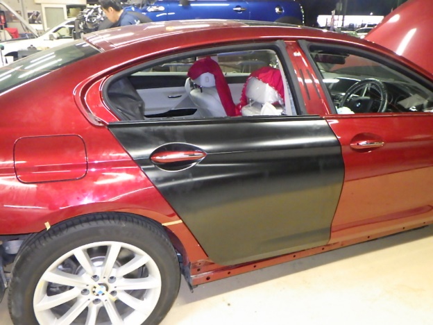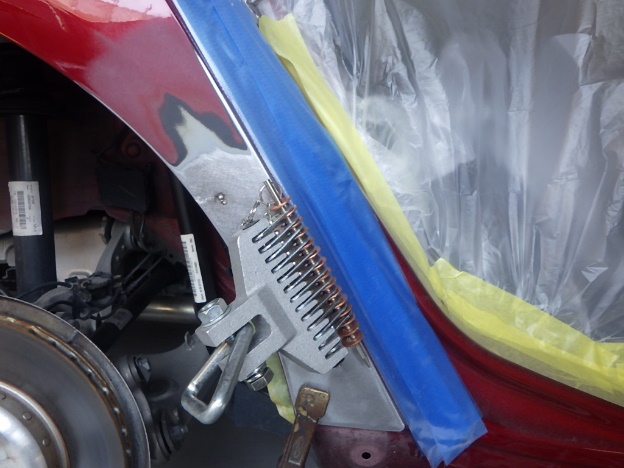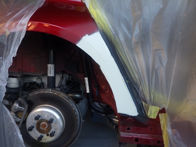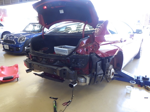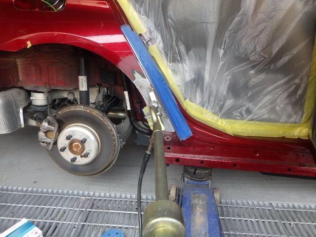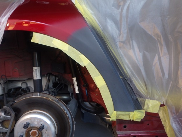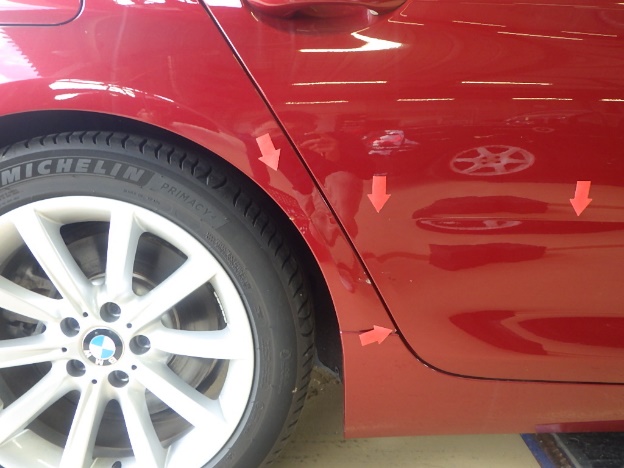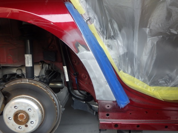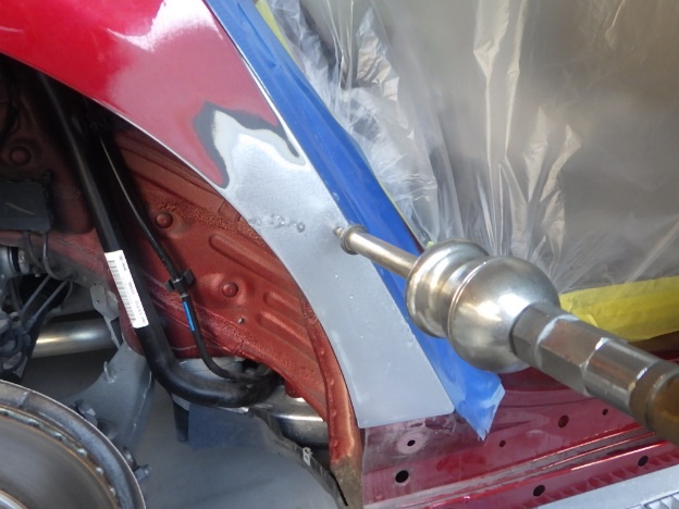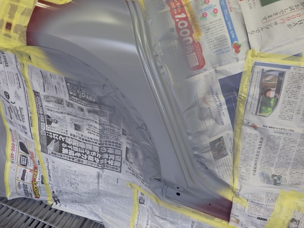 仮合わせ作業の後、リアフェンダー損傷箇所の板金作業を行いました。
