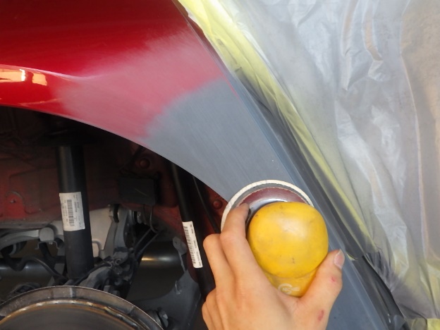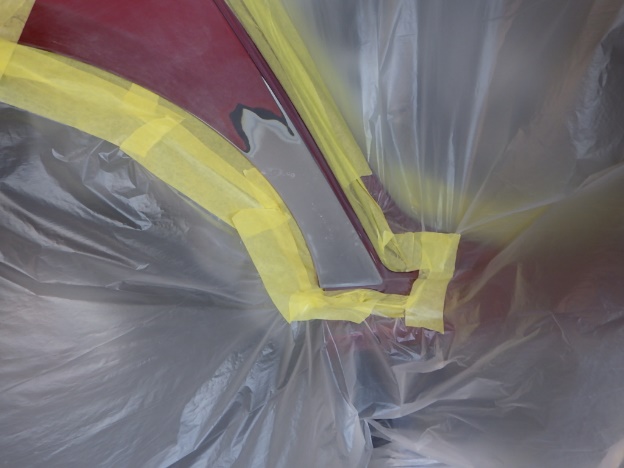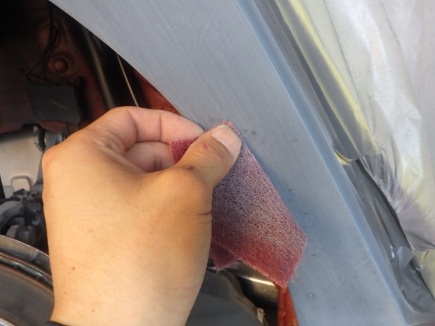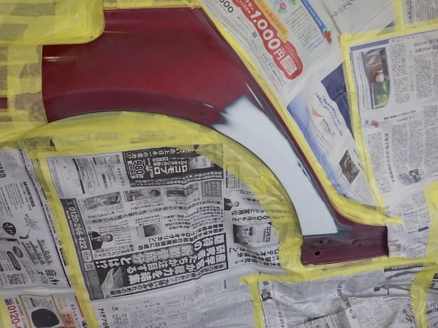 パテ乾燥の後、サンディング作業、マスキング作業、脱脂作業、エアブローを行い、
