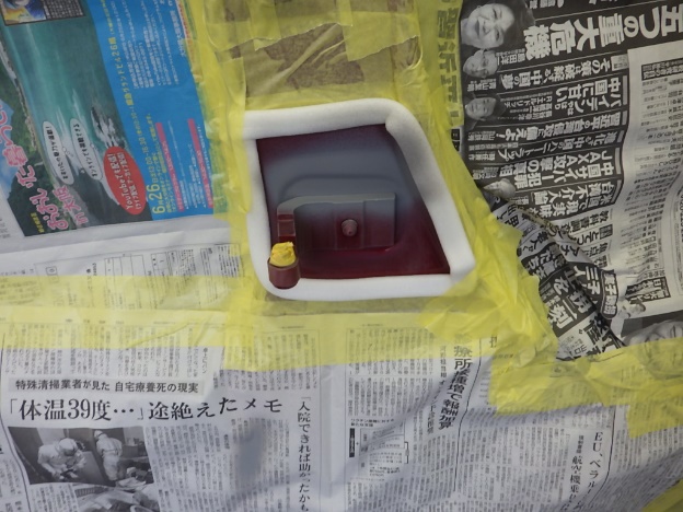 サフェーサー乾燥の後、足付け作業、脱脂作業、エアブローを行い、