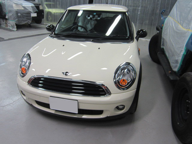 【鈑金塗装】【事故】兵庫県神戸市、商品車、2010y、MINI、R56、フロントバンパー損傷へこみ修理レポートです!ありがとうございました。