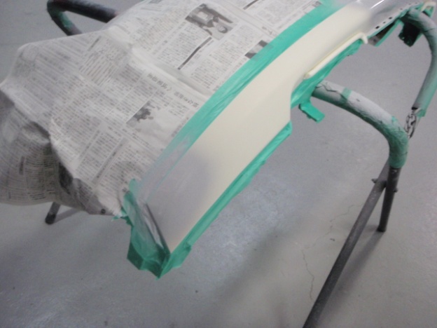 サフェーサー乾燥の後、足付け作業、マスキング作業、脱脂作業、エアブローを行い、