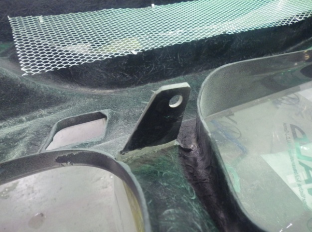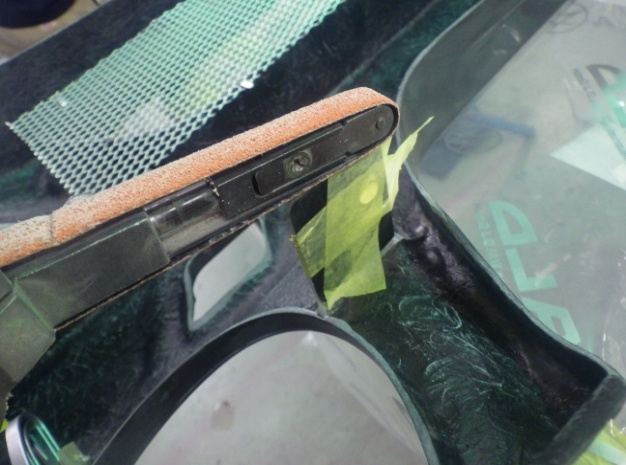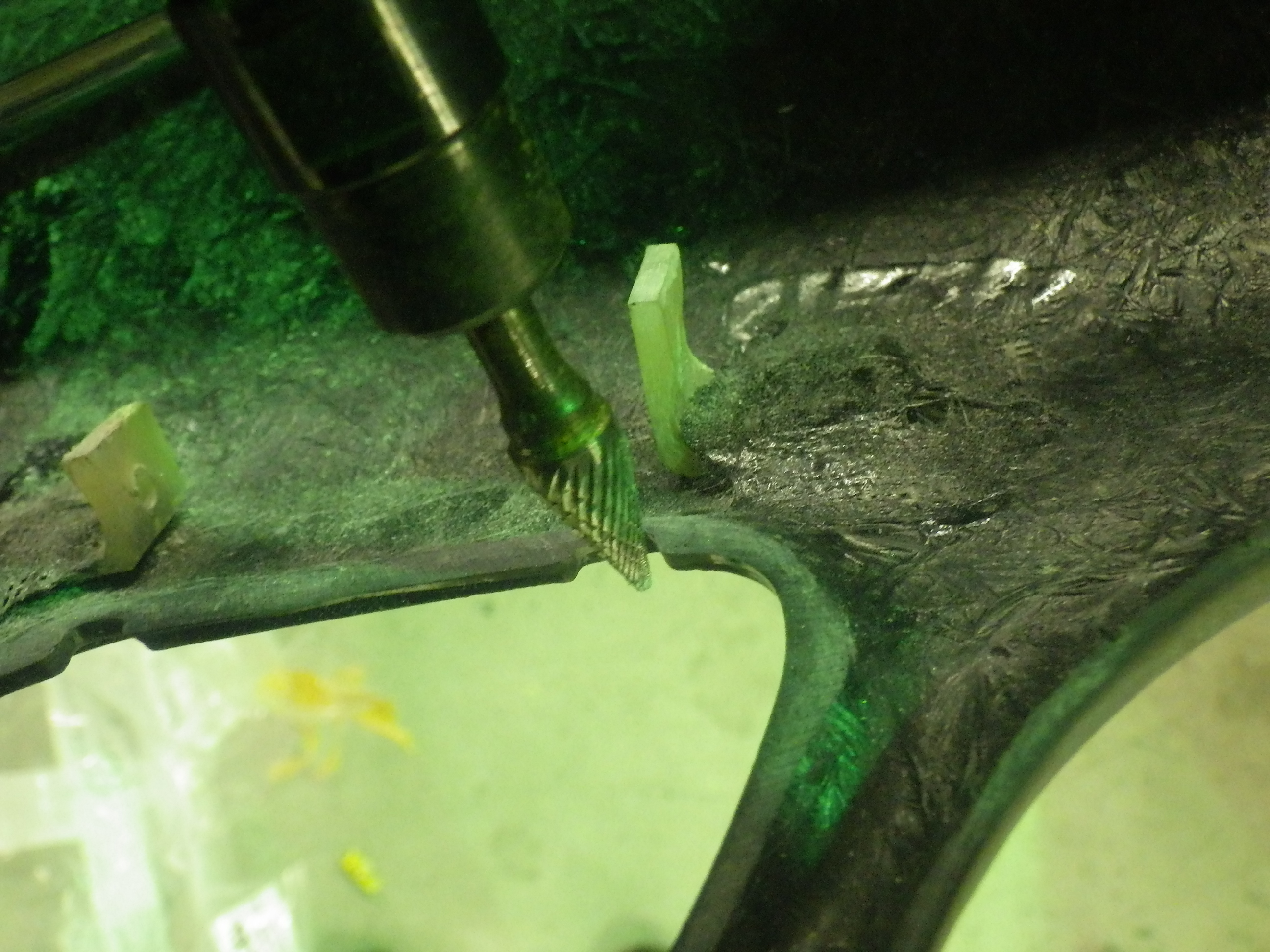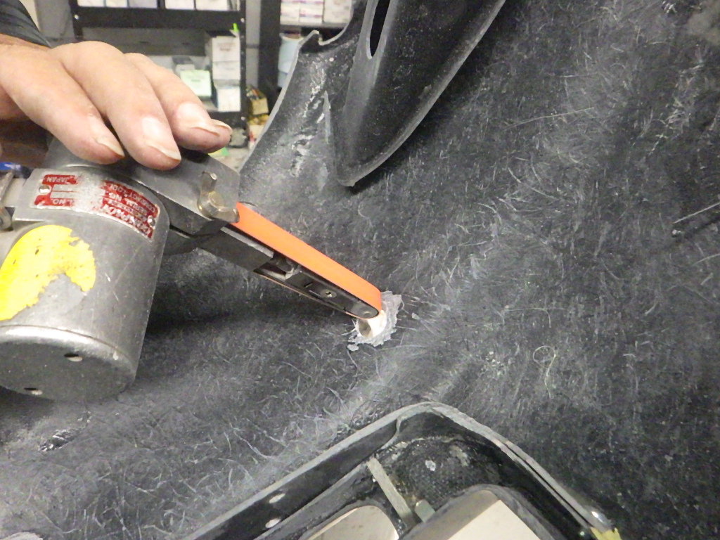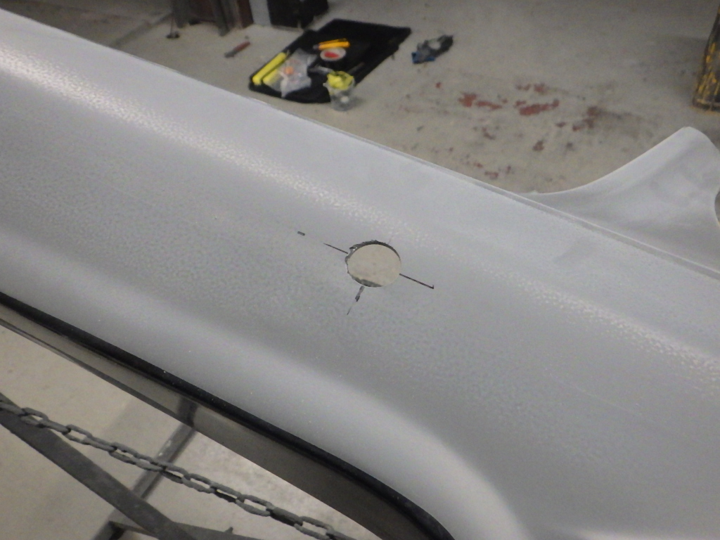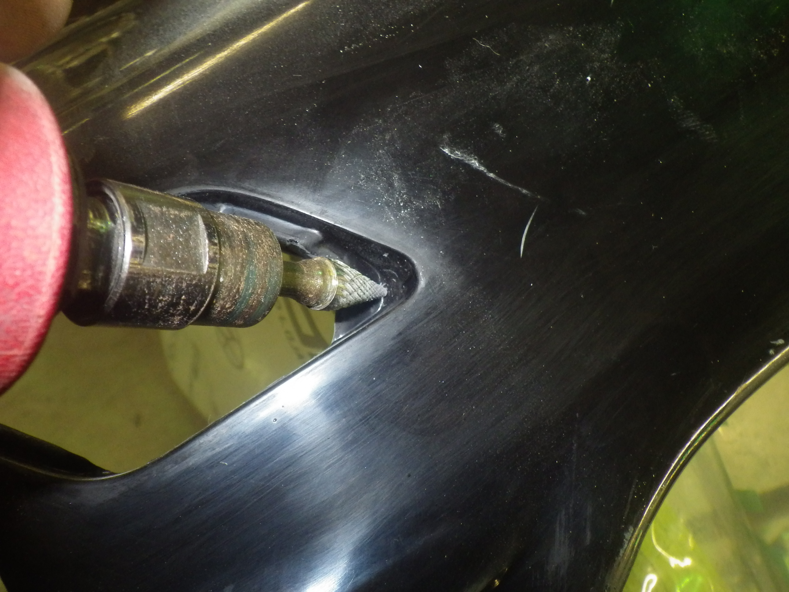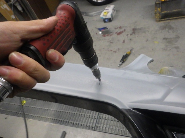 サフェーサー乾燥の後、PDCセンサーの取付穴の加工作業を行いました。
