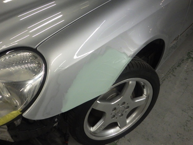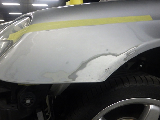 フェンダーの修正箇所の板金作業、脱脂作業、エアブローを行い、