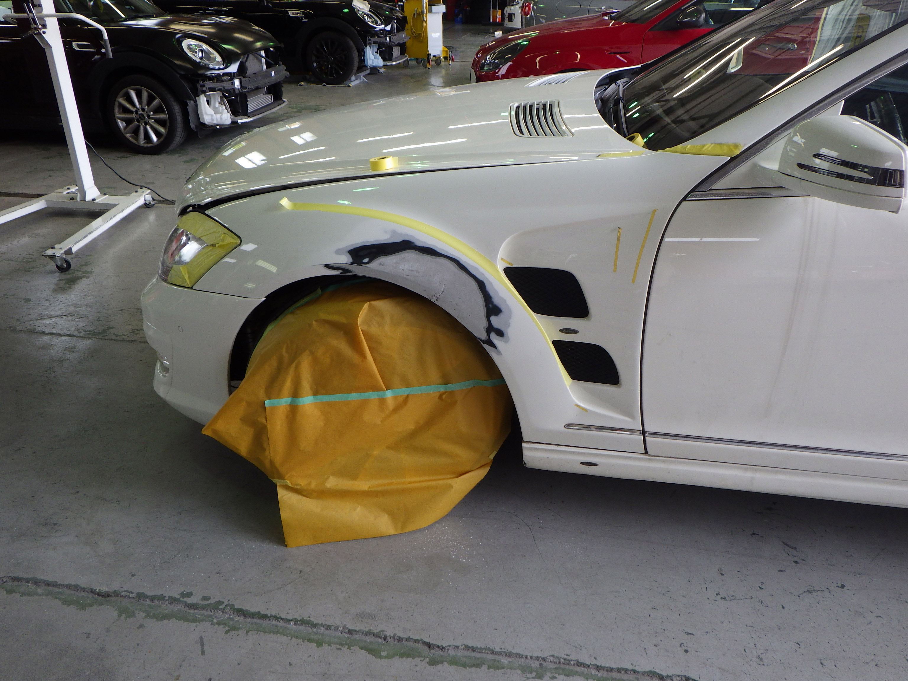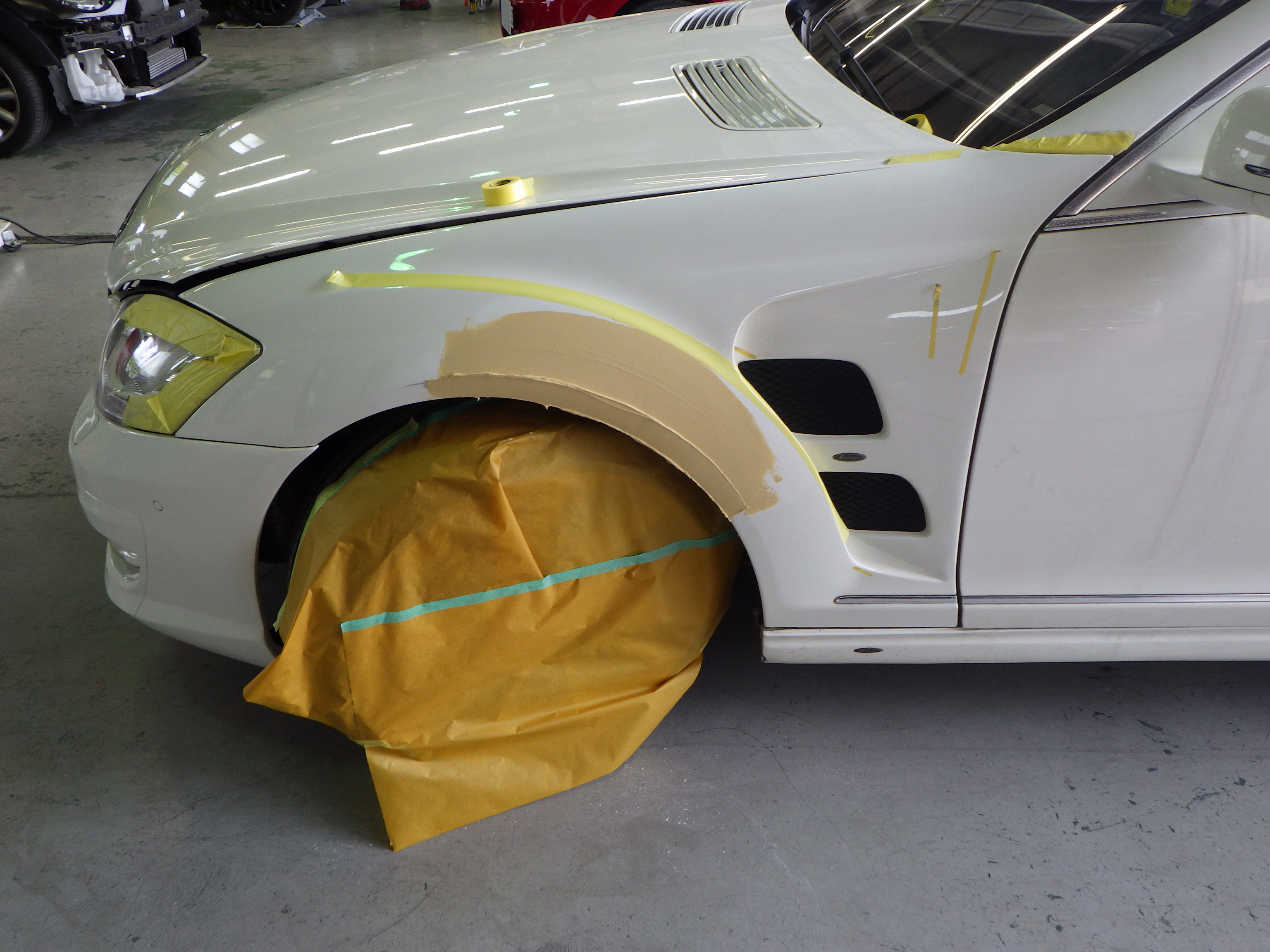 パテ乾燥の後、サンディング作業、マスキング作業、脱脂作業、エアブローを行い、
