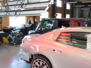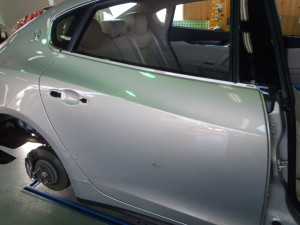 フロンとドア、リヤドア、リヤフェンダーのパテ修正作業を進めていきました。
