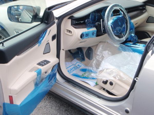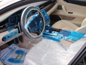 入庫時確認作業の後、室内のキズ汚れ防止の為に、ハンドル、シートカバー、