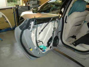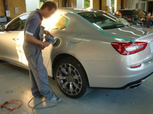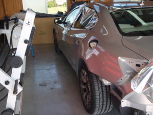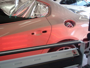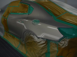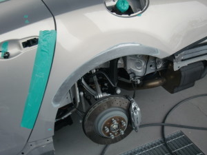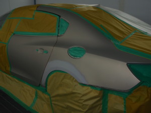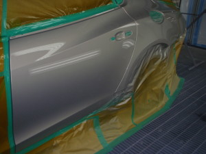 サフェーサー水研ぎ後、リアドア・リアフェンダーの足付け作業を行いました。