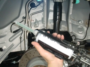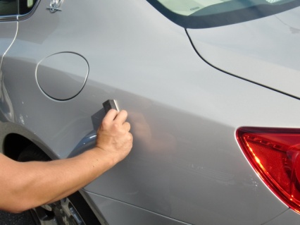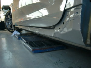 リヤフェンダー及びホイルハウスの大まかな修正作業の後、スタッドという器具を使い、パネルの引き出し作業を行います。