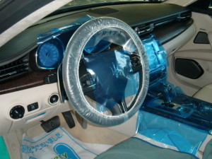 入庫時確認作業の後、室内のキズ汚れ防止の為に、ハンドル、シートカバー、保護テープの貼り付け作業を行いました。