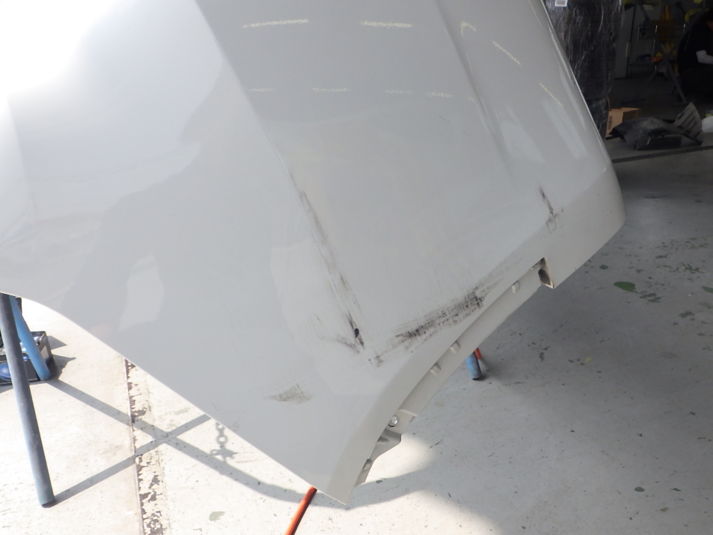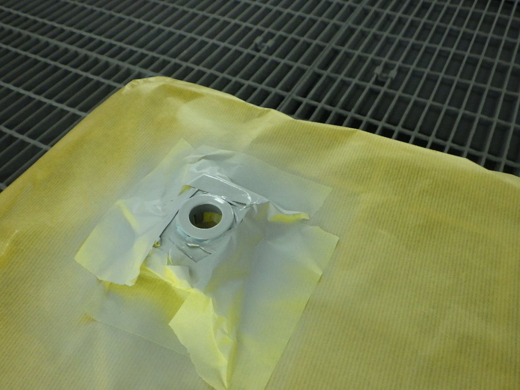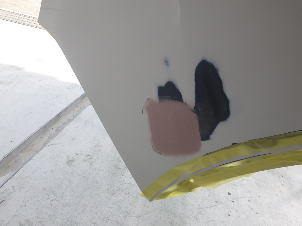 パテ乾燥の後、サンディング作業、マスキング作業、脱脂作業、エアブローを行い、
