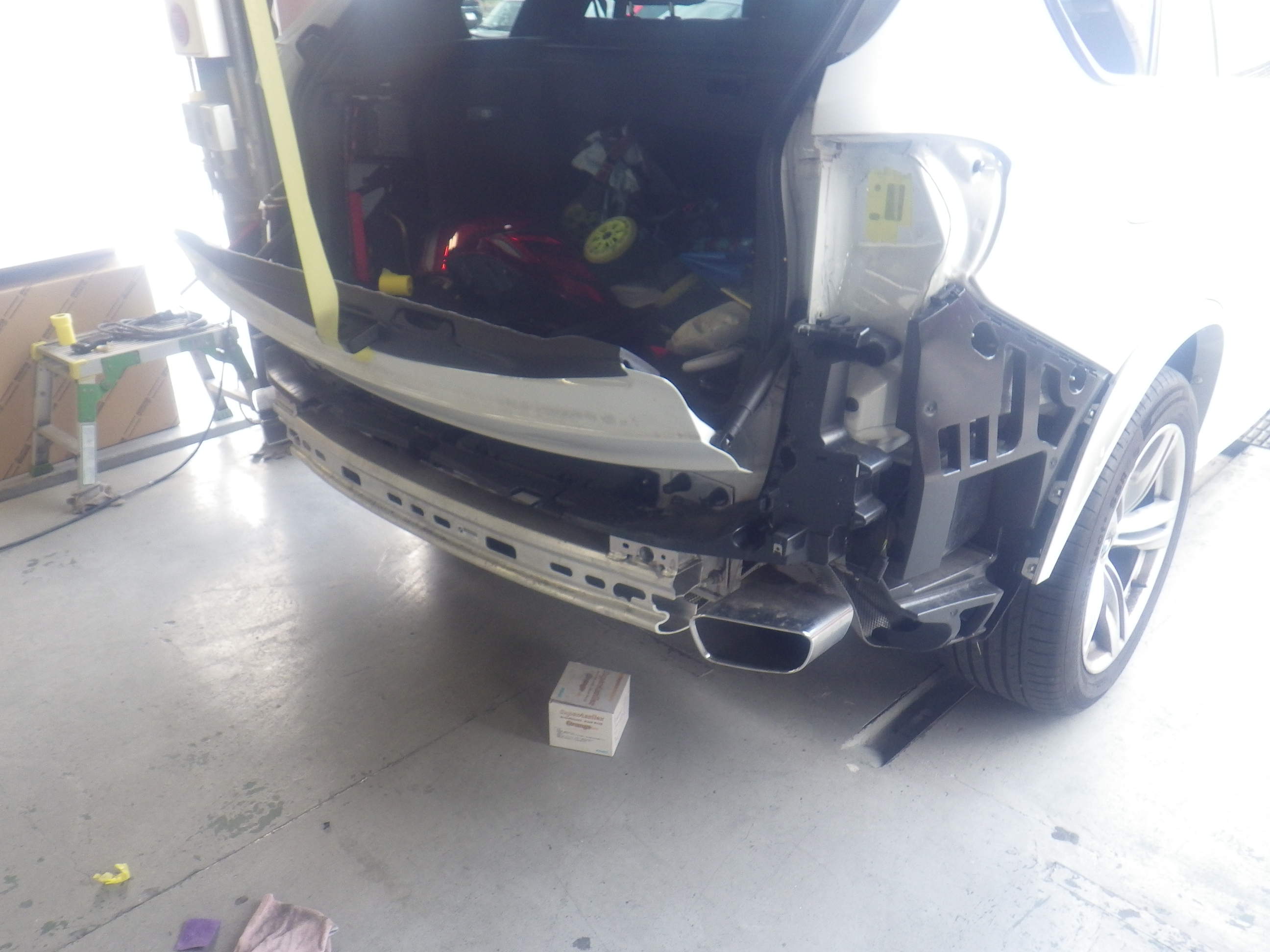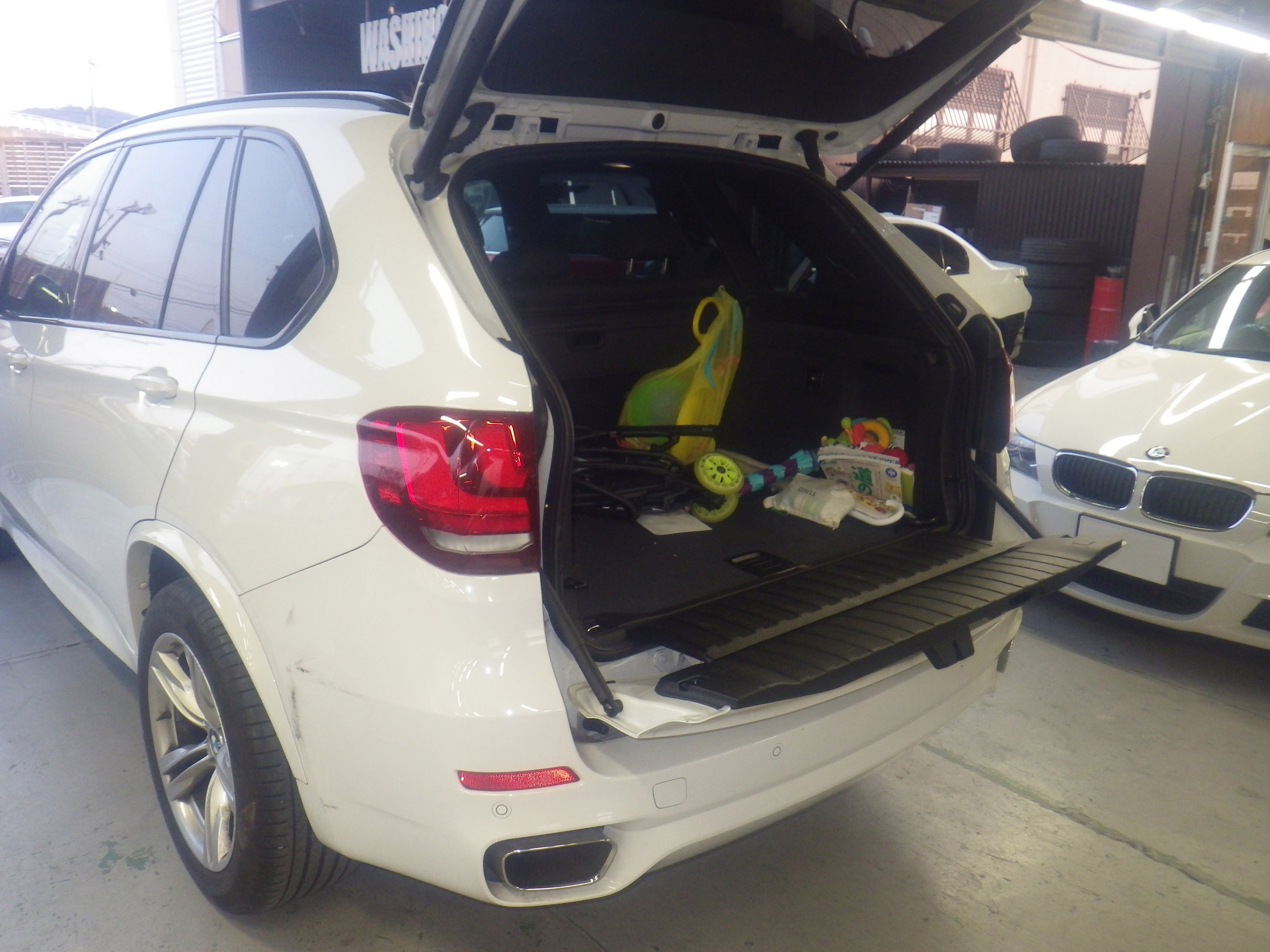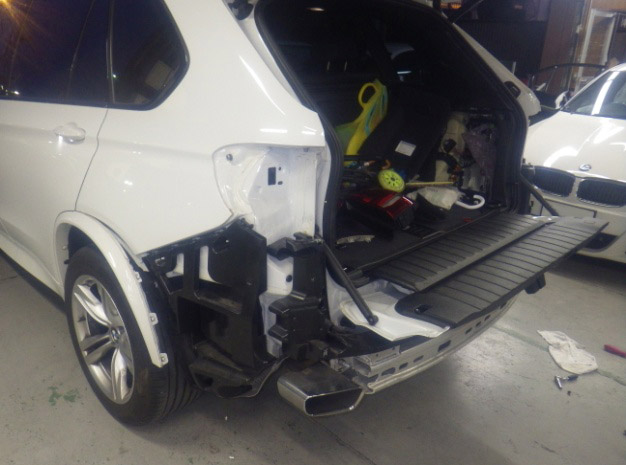 Home » 未分類 » 【鈑金塗装】【事故】兵庫県神戸市、A様、BMW、X5、F15、リアバンパー損傷へこみ修理レポートです!ありがとうございました。
