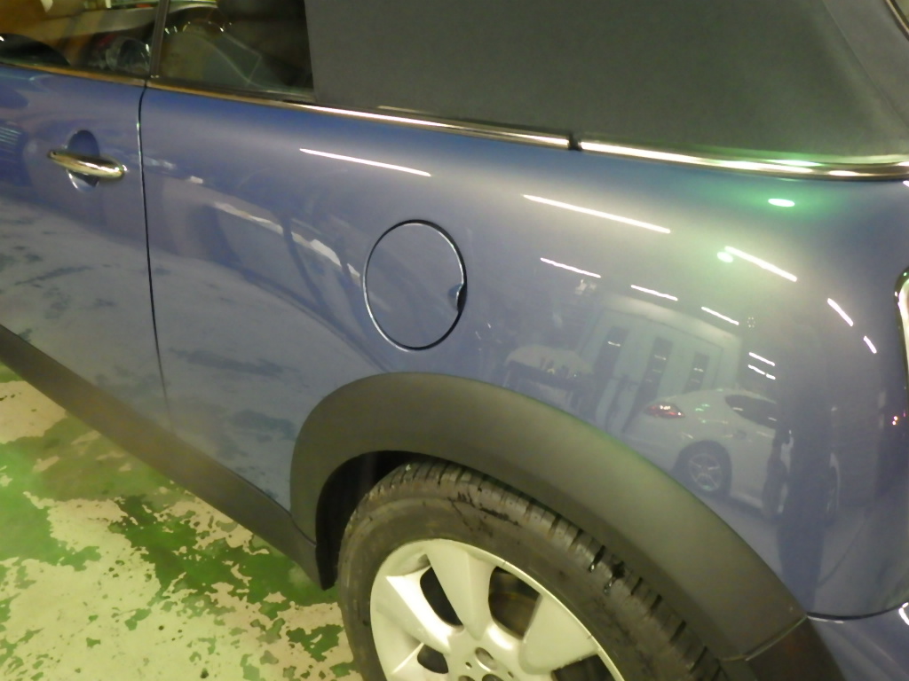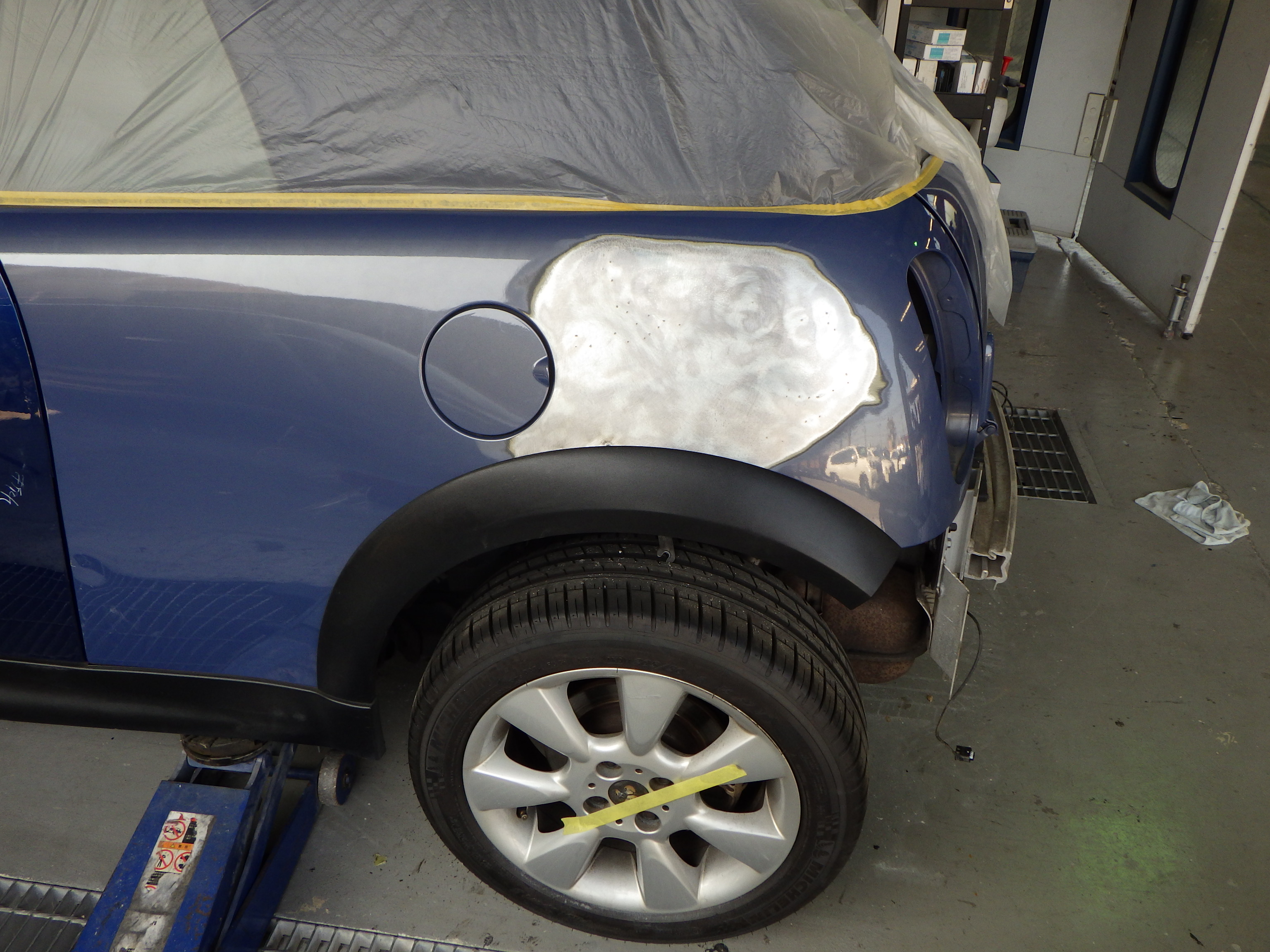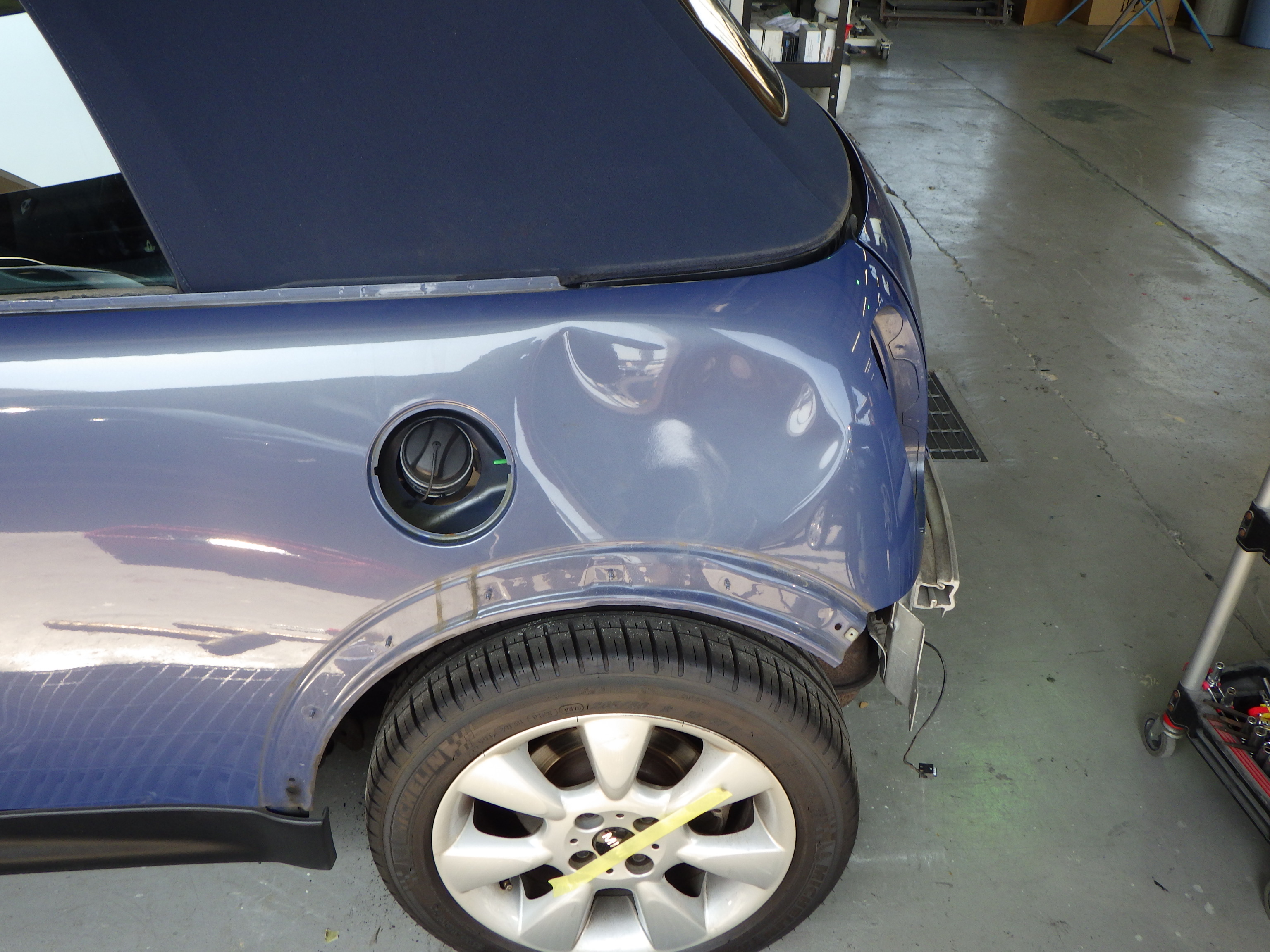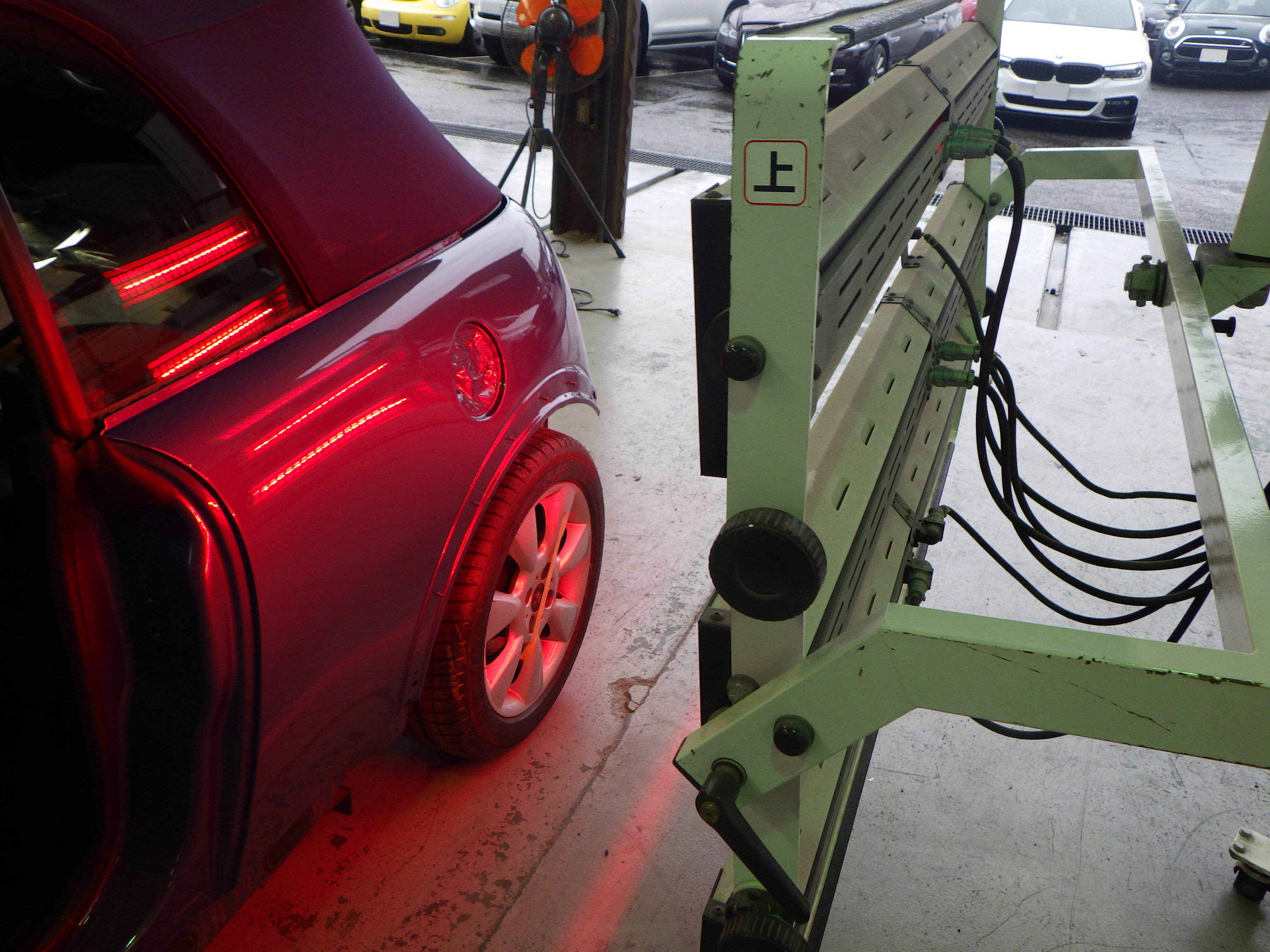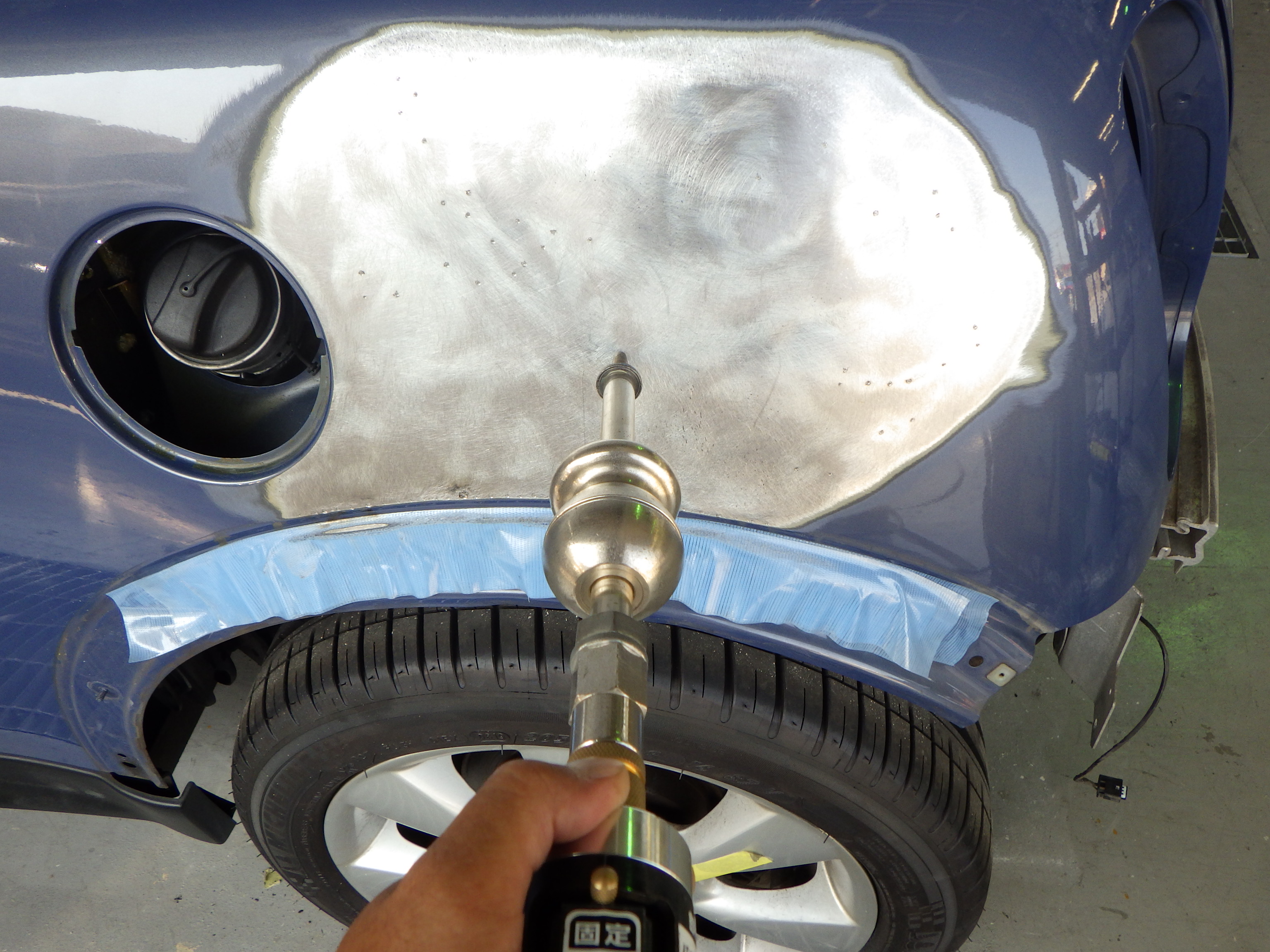 仮合せ作業の後、リアフェンダーの損傷箇所の板金作業を行いました。