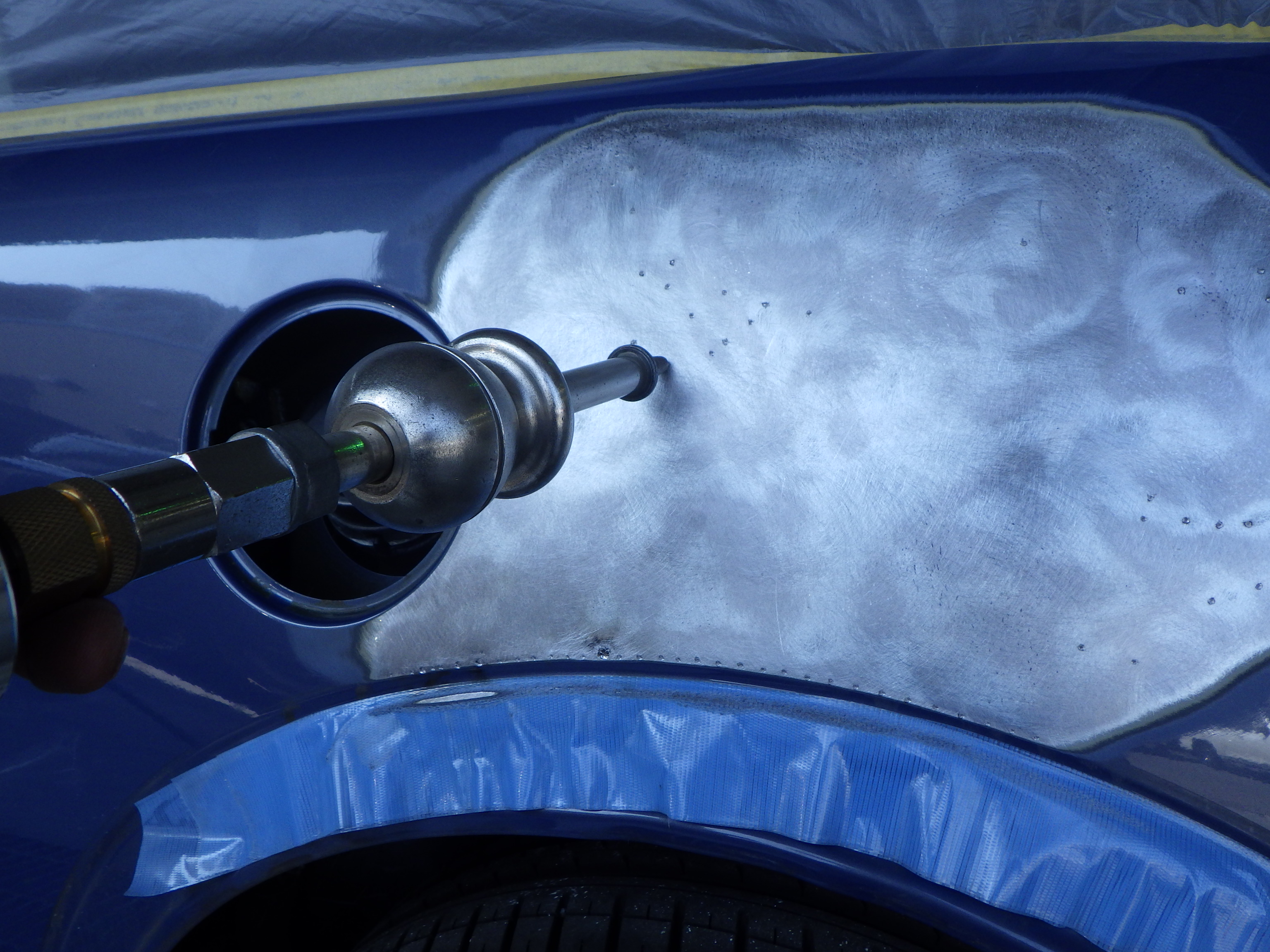 板金作業の後、脱脂作業、エアブローを行い、パテ付け作業を行いました。