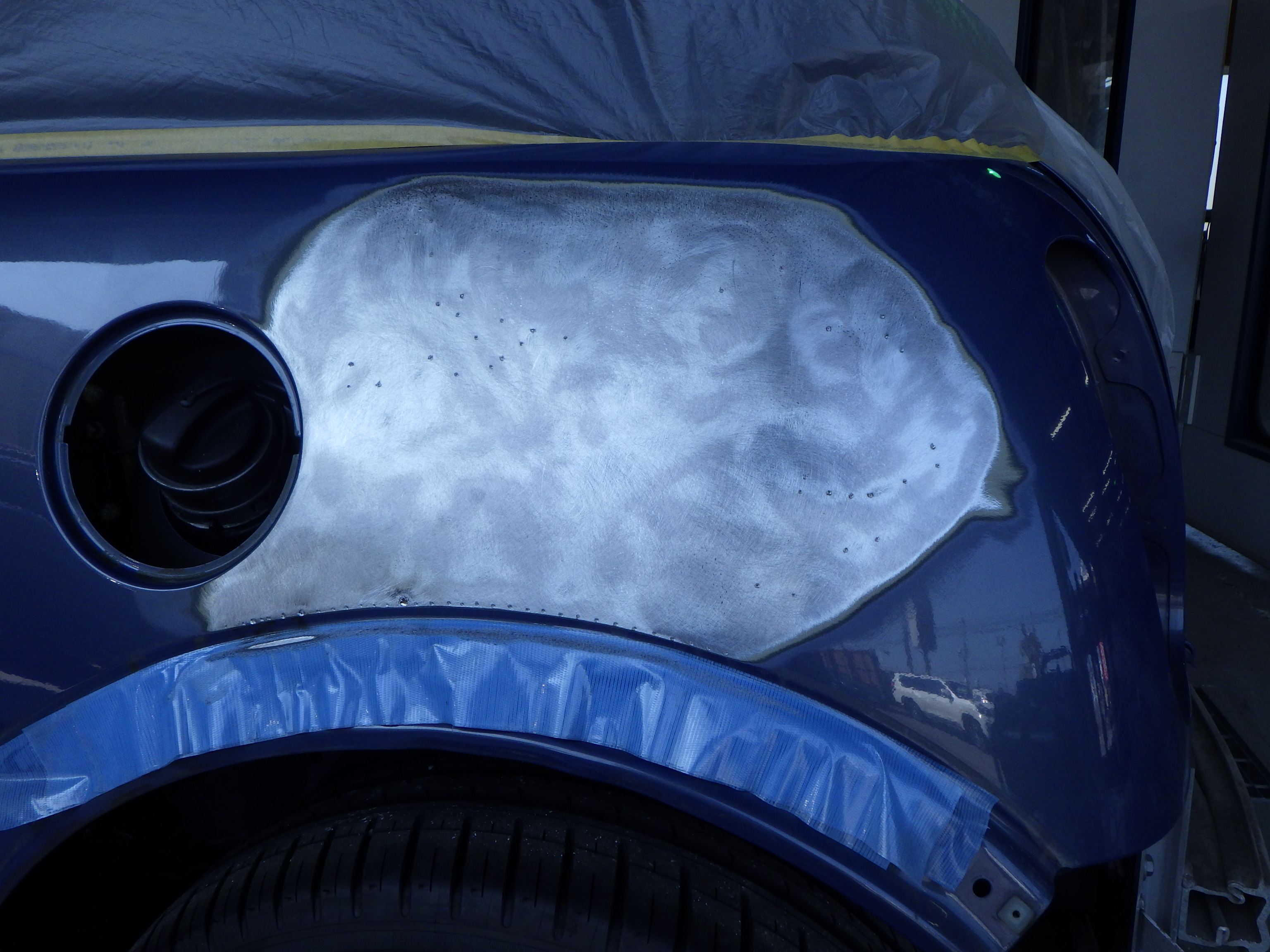 パテ乾燥の後、サンディング作業、マスキング作業、脱脂作業、エアブローを行い、