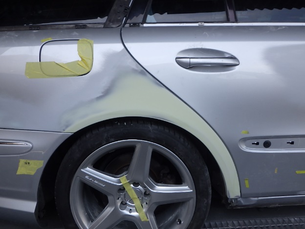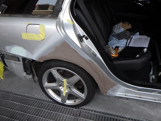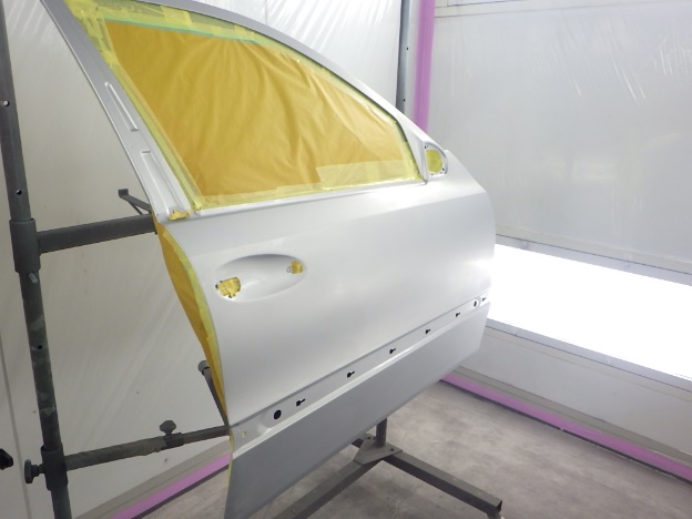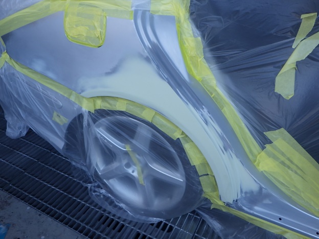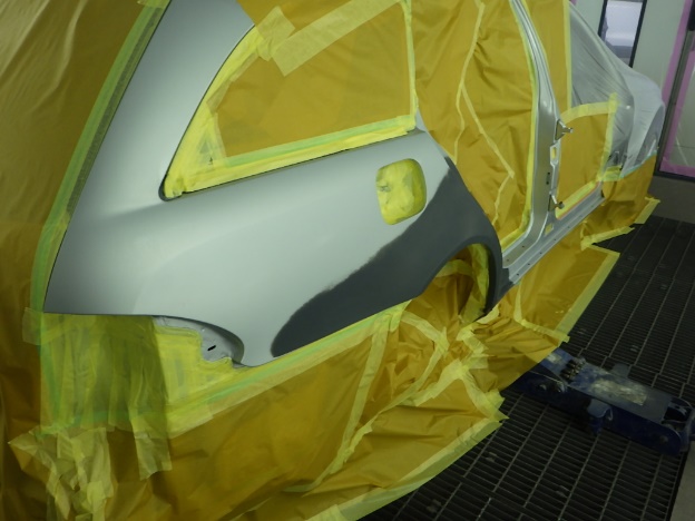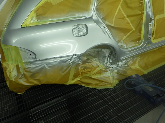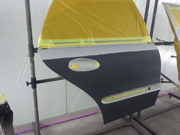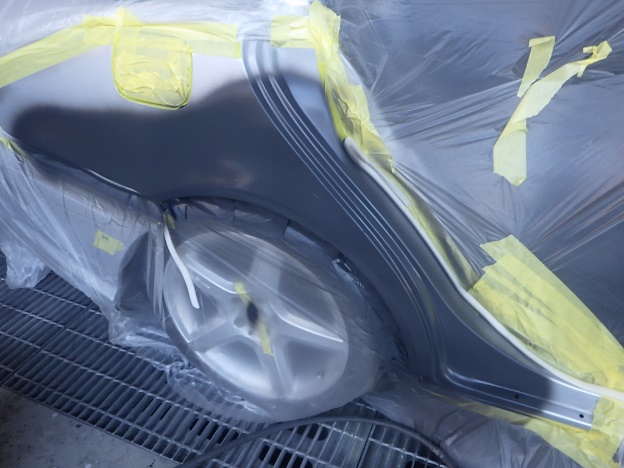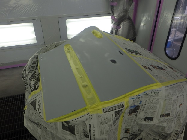 修正作業の後、塗装準備(足付け、マスキング、脱脂、エアブロー)を行い、サフェーサーの塗布作業を行いました。