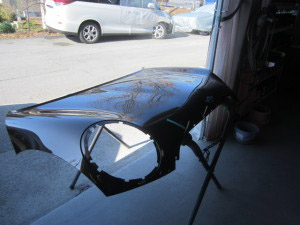 ボンネットの分解作業、板金作業、マスキング作業を行い、