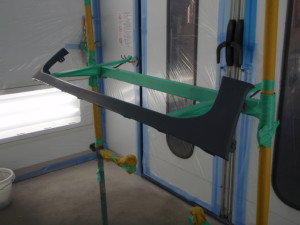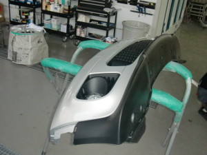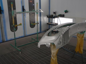 サフェーサー水研ぎ後、塗装ブース内に入れ、シリコンオフで脱脂、エアブローして塗装作業開始です。