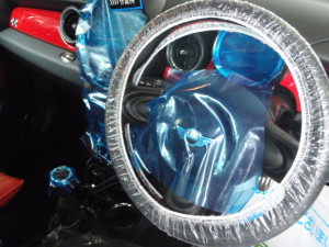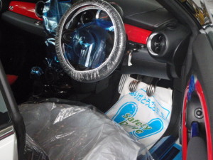 入庫時確認作業の後、室内のキズ汚れ防止の為にハンドル・シートカバー、保護テープの貼り付け作業を進めていきました。