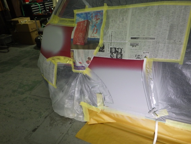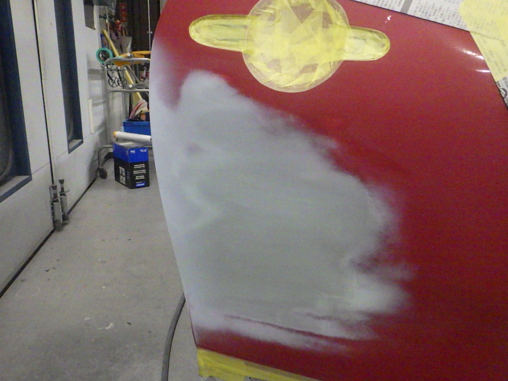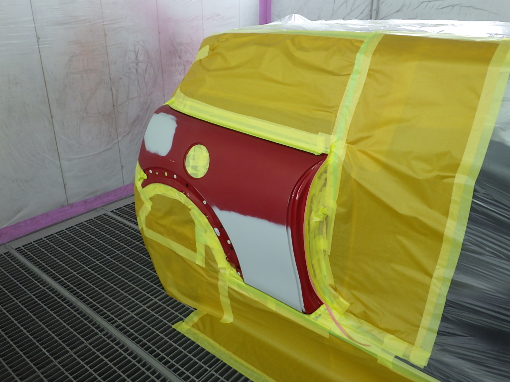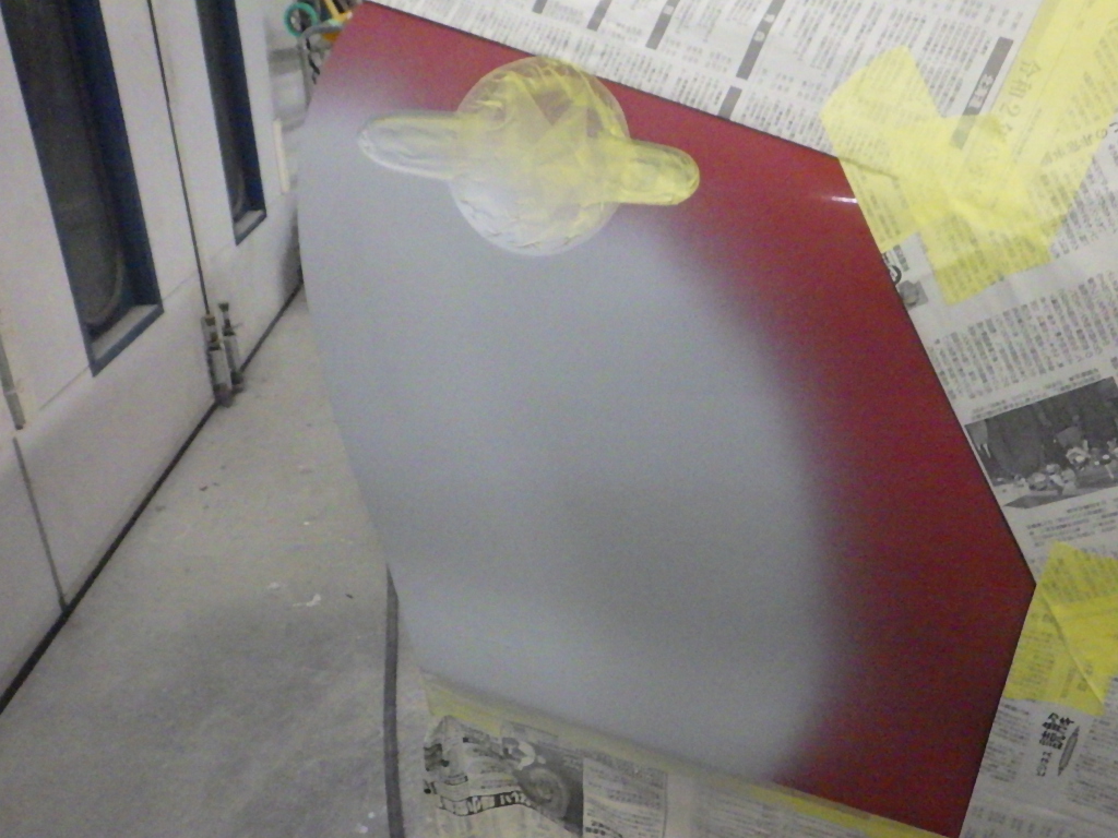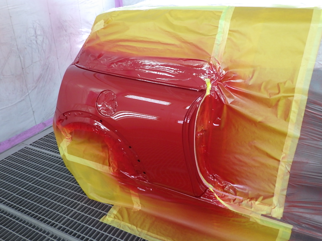 ベースコート(赤)、トップコート(クリヤー)の順に塗装作業を行いました。