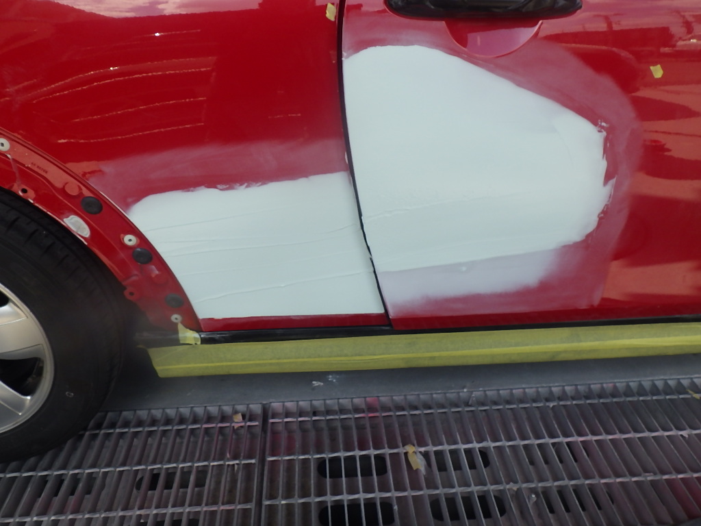パテ乾燥の後、サンディング作業、マスキング作業、脱脂作業、エアブローを行い、