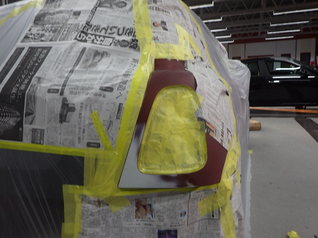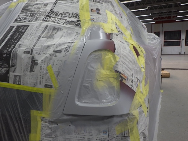 パテ乾燥の後、サンディング作業、マスキング作業、脱脂作業、エアブローを行い、