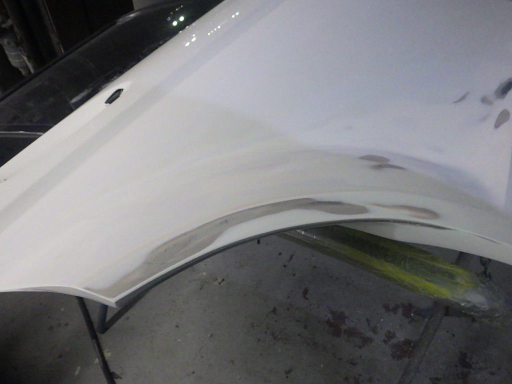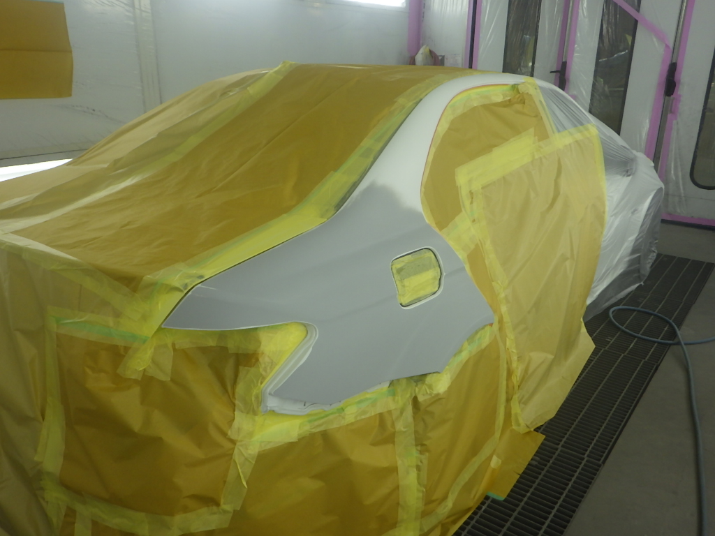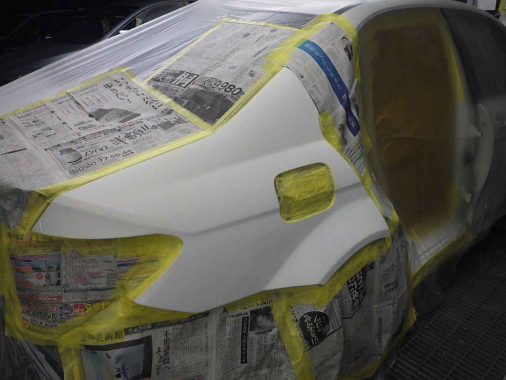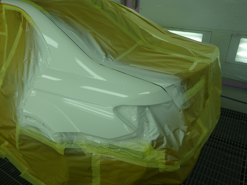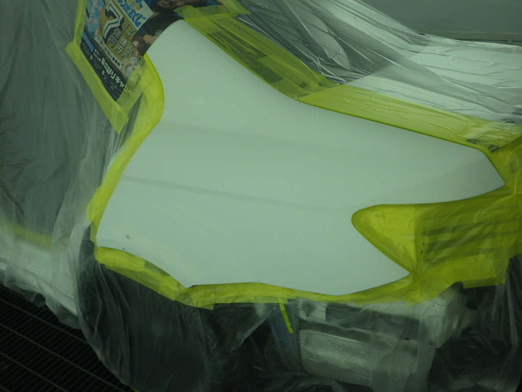 修正作業の後、塗装準備(足付け、マスキング、脱脂、エアブロー)を行い、