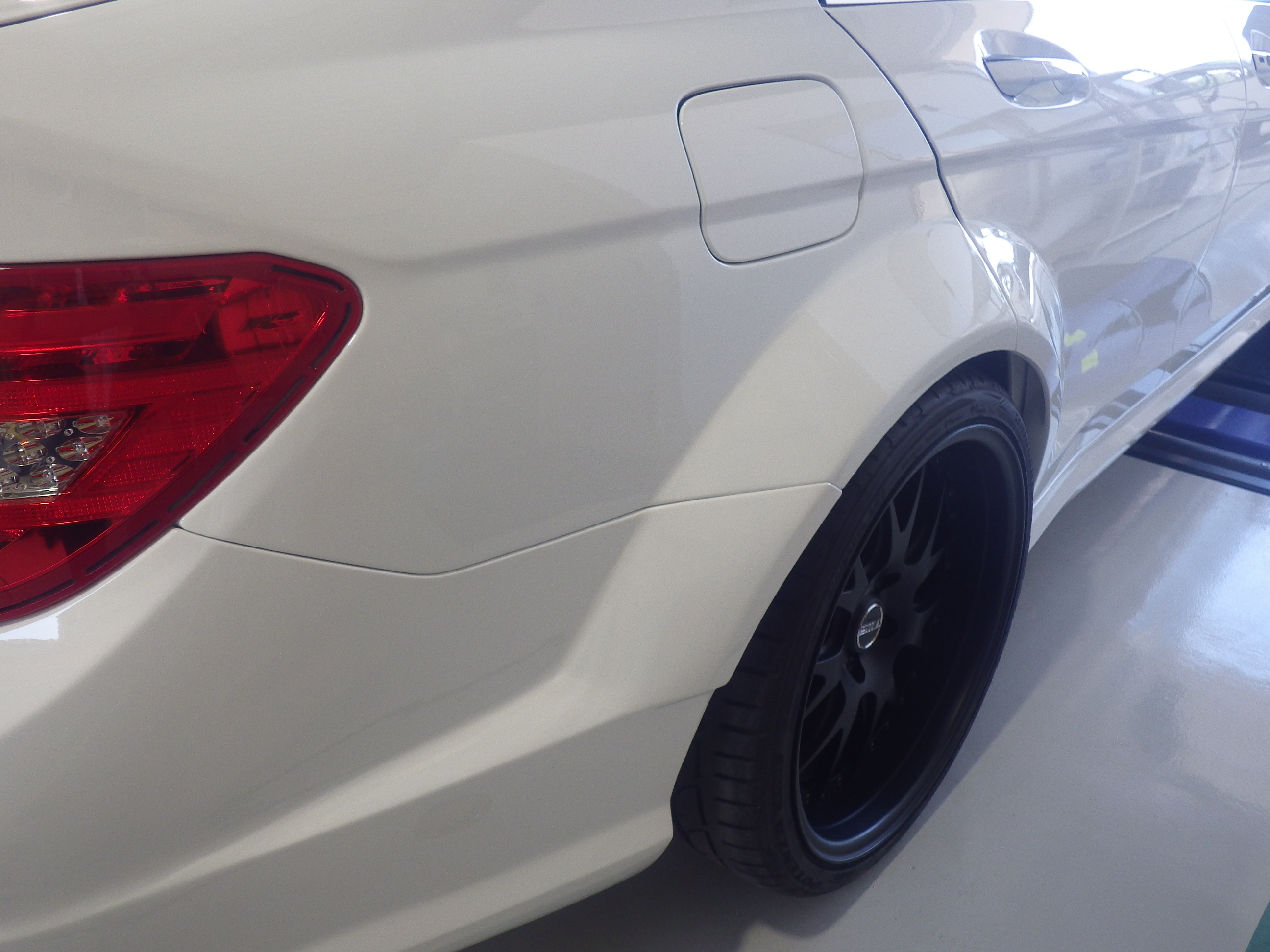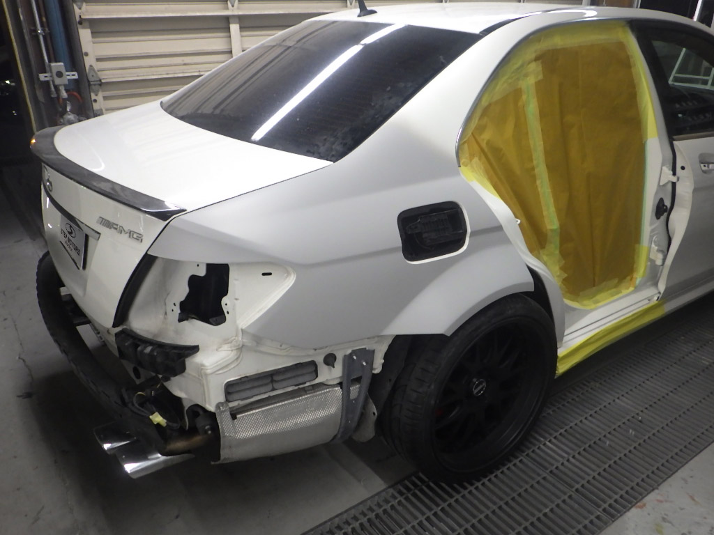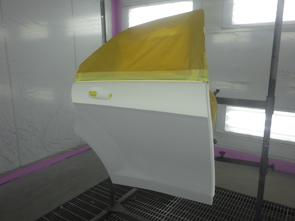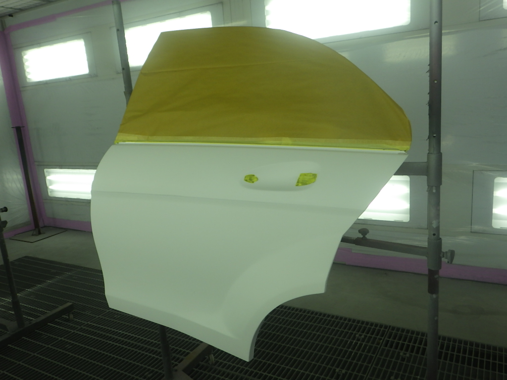 修正作業の後、塗装準備(足付け、マスキング、脱脂、エアブロー)を行い、