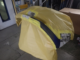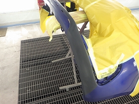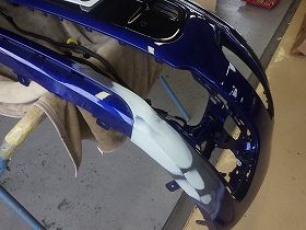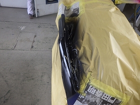 パテ付けの後、サンディング作業、塗装準備(足付け、マスキング、脱脂、エアブロー)を行い、