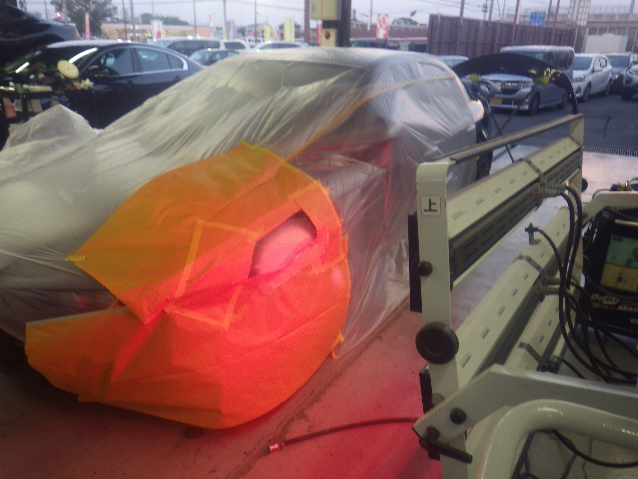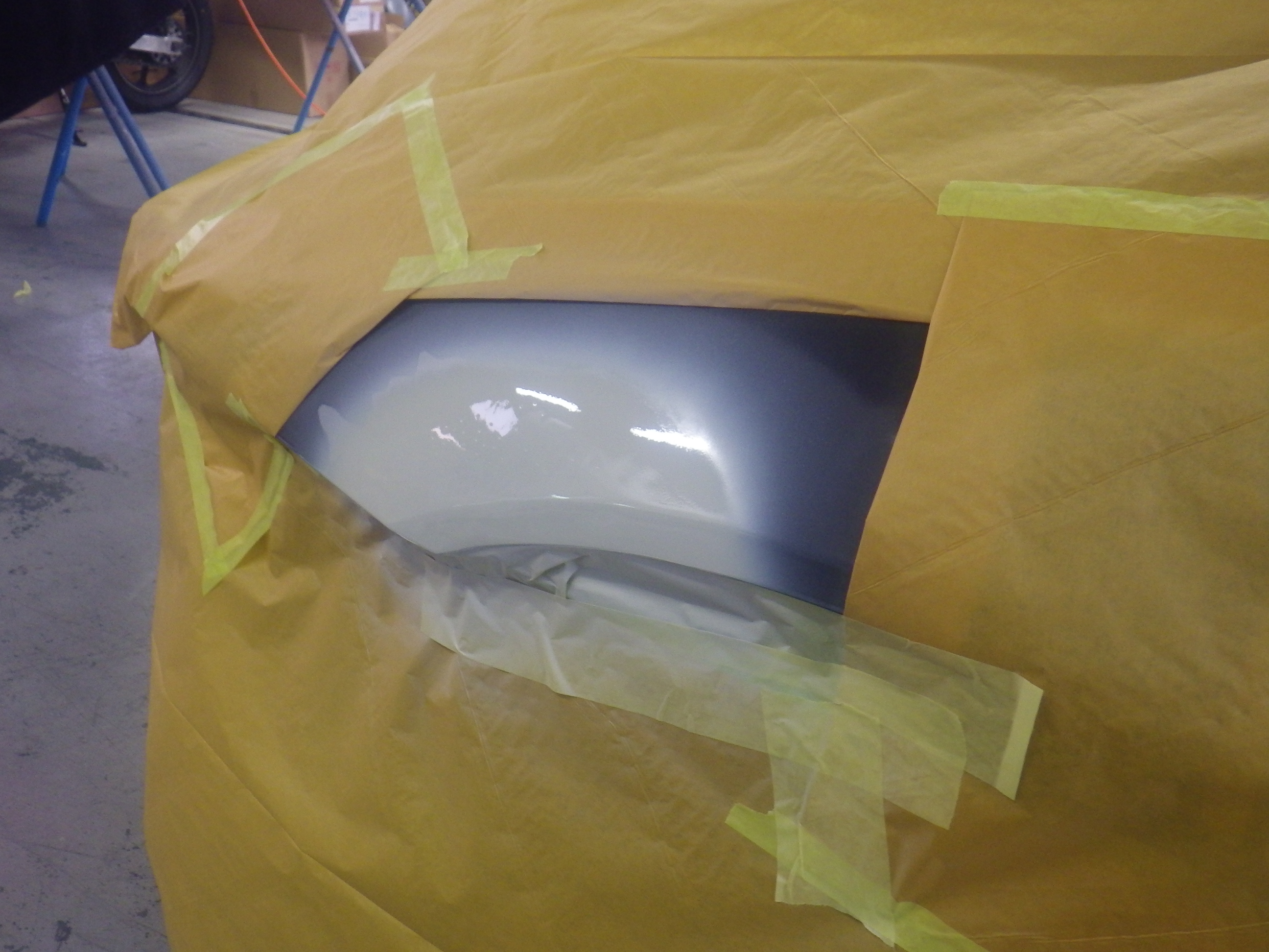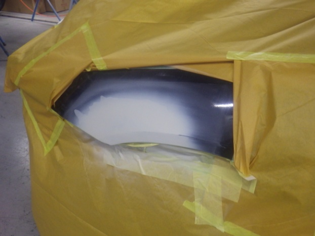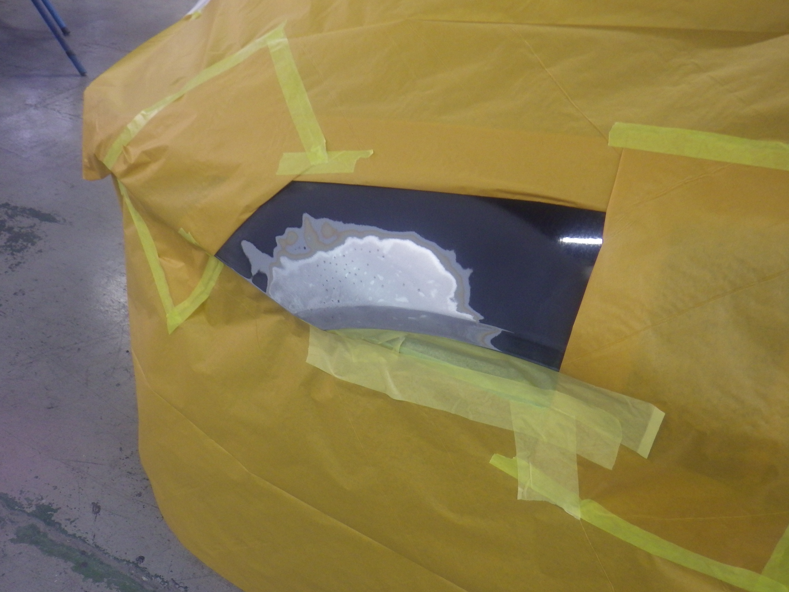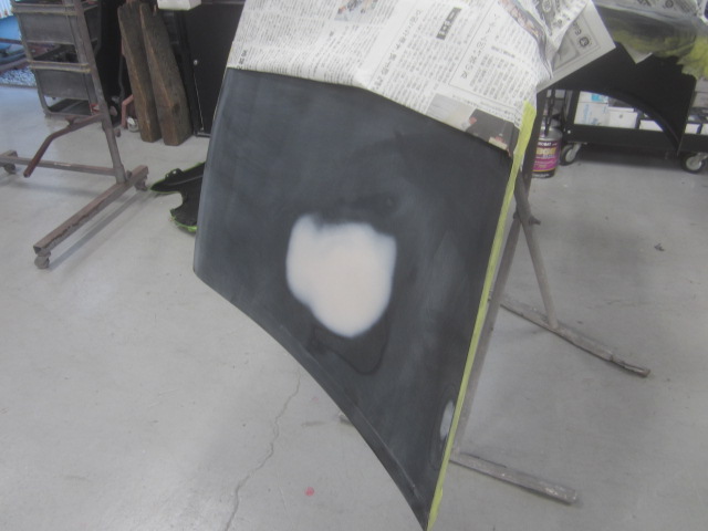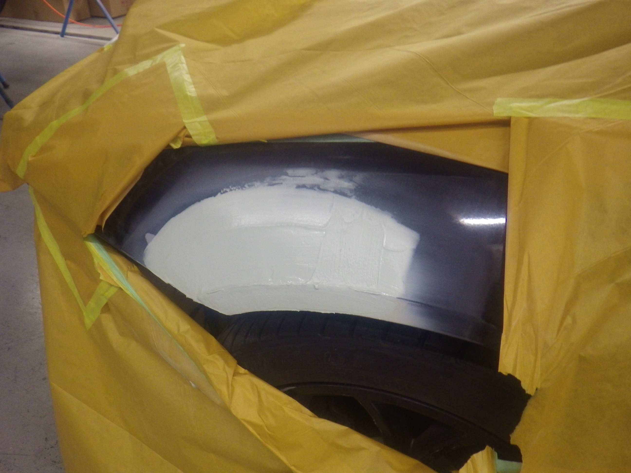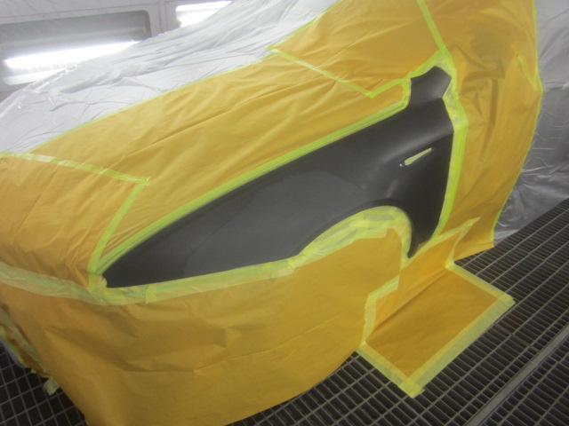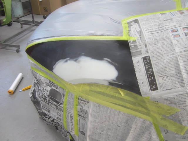 パテ乾燥の後。サンディング作業、マスキング作業、脱脂作業、エアブローを行い、