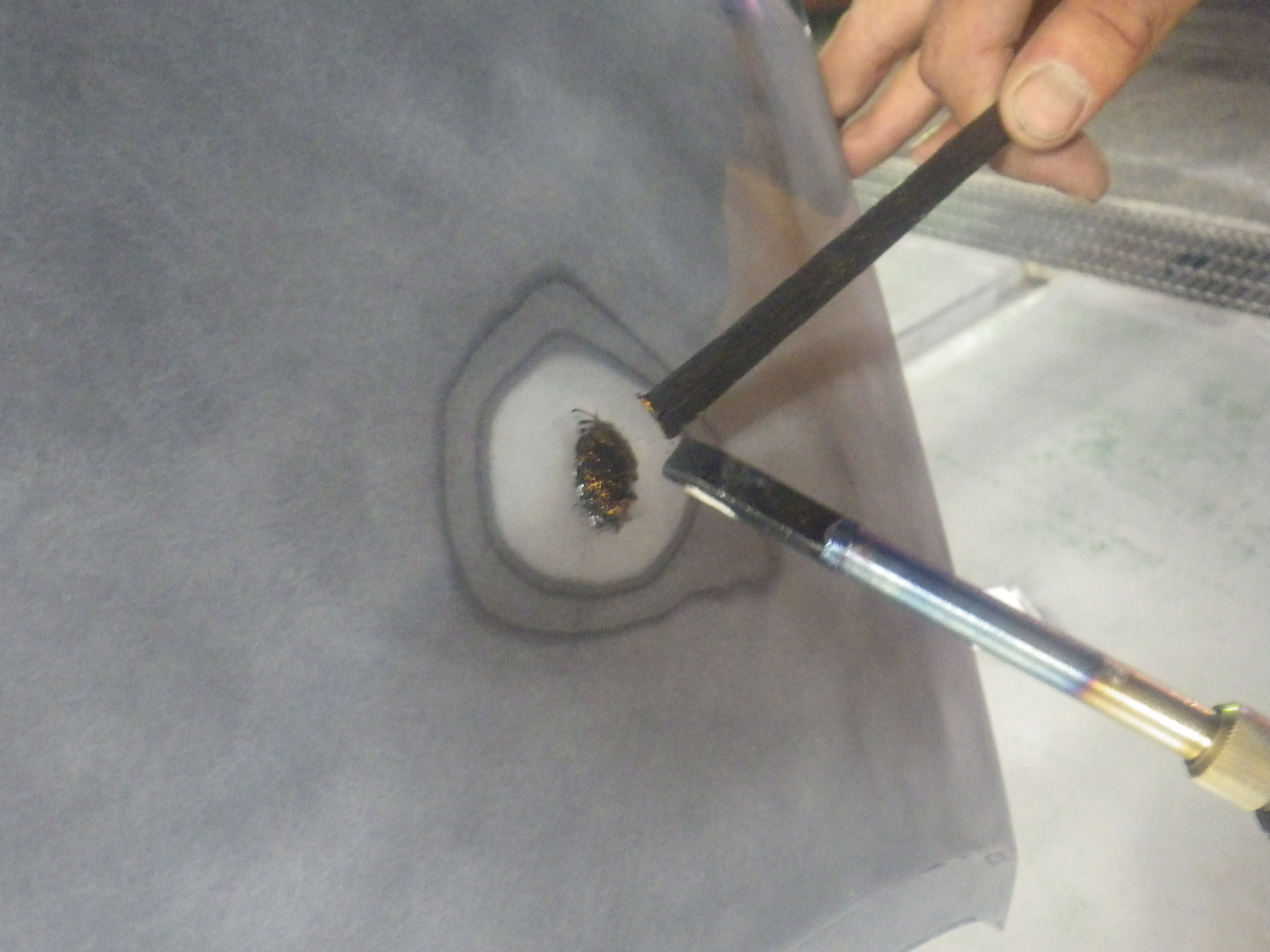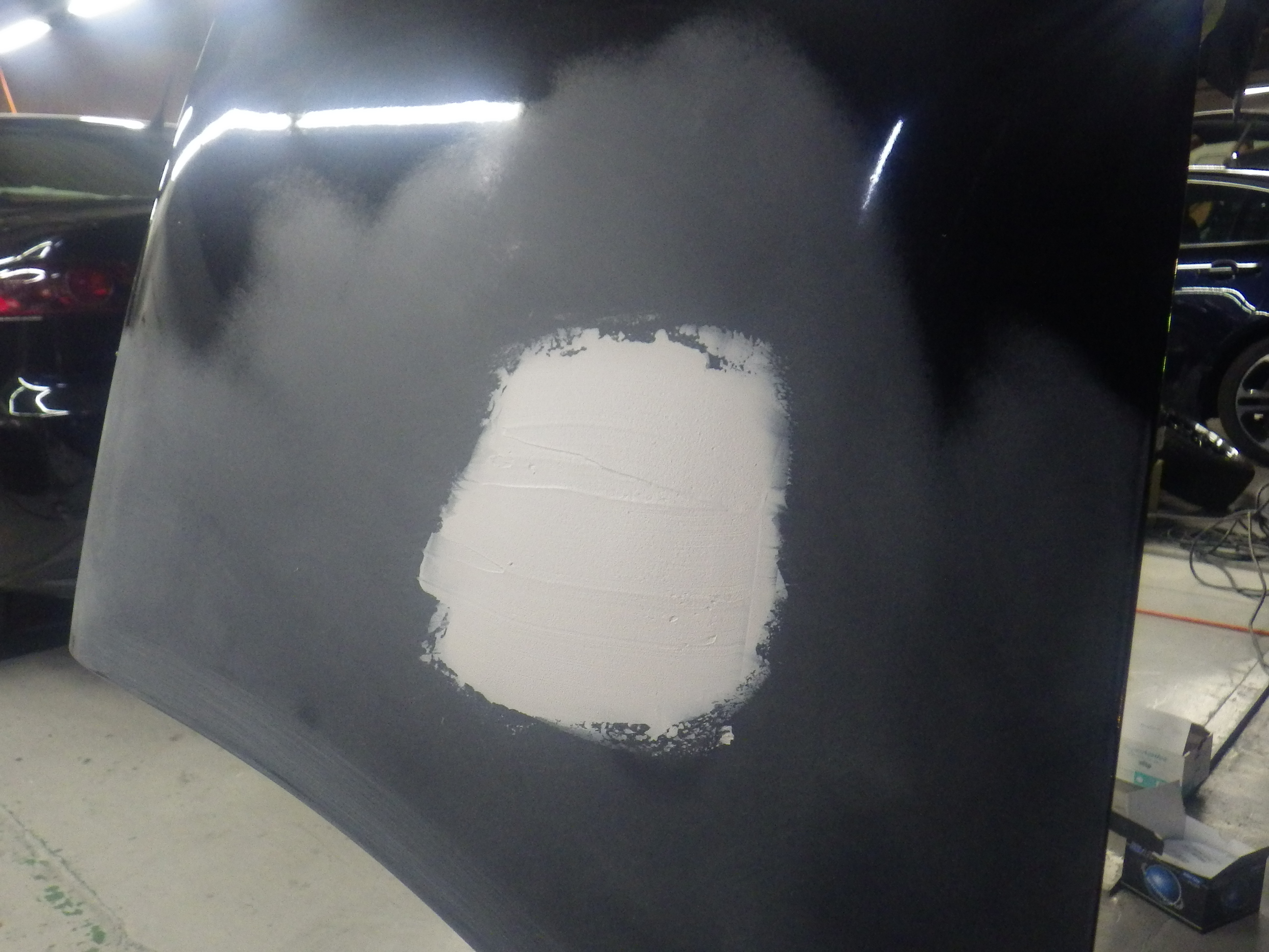 修正作業の後、足付け作業、脱脂作業、エアブローを行い、パテ付け作業を行いました。