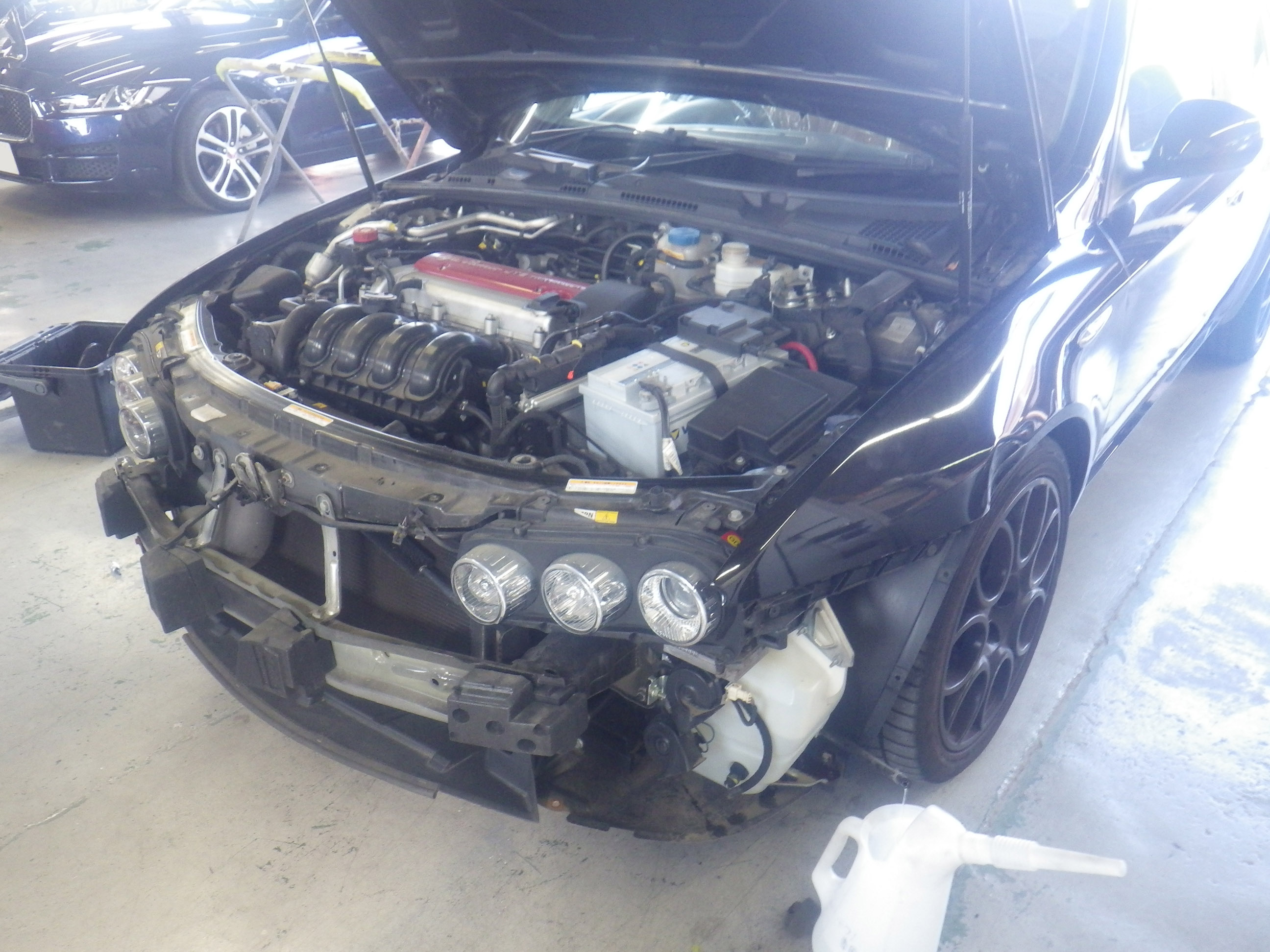 右フロント周り損傷での入庫になります。 入庫確認作業の後、キズ、汚れ防止の為、シートカバー、 ハンドルカバーの取り付け作業を行いました。 修正作業を行う為、分解…