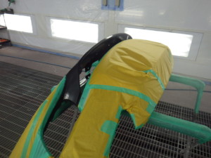 塗装乾燥の後、足付け作業、マスキング作業、エアブローを行い、