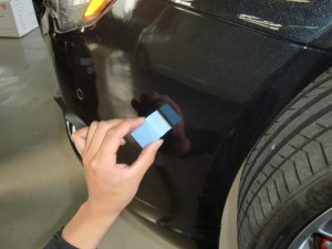 パテ乾燥の後、サンディング作業、マスキング作業、脱脂作業、エアブローを行い、