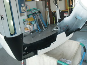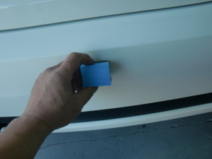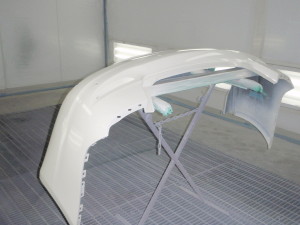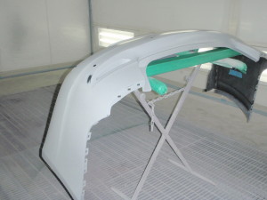 新品バンパーの足付け作業、マスキング作業、脱脂作業、エアブローを行い、