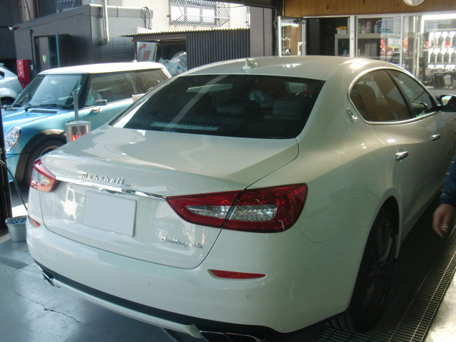 【鈑金塗装】【事故】兵庫県神戸市、K様、2013y、マセラティ、クアトロポルテ、リアバンパー損傷へこみ修理レポートです!ありがとうございました。