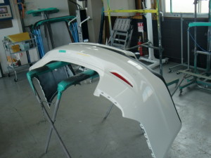 乾燥完了後、リヤバンパー付属品組み付け、車両本体に組み付け後、磨き作業、コーティング施工、