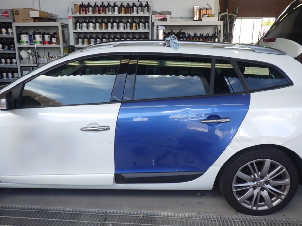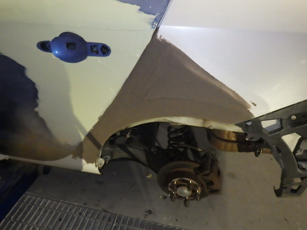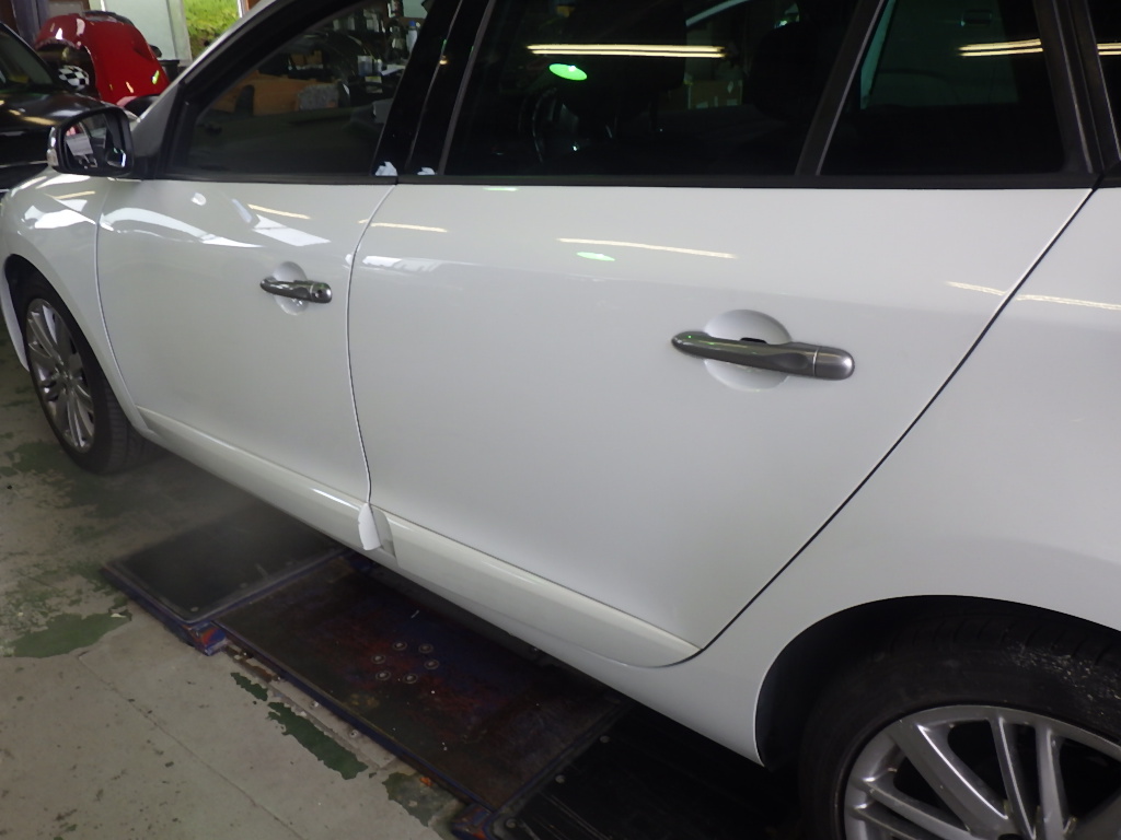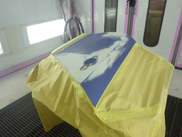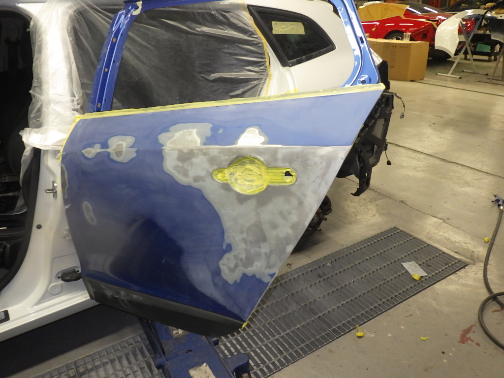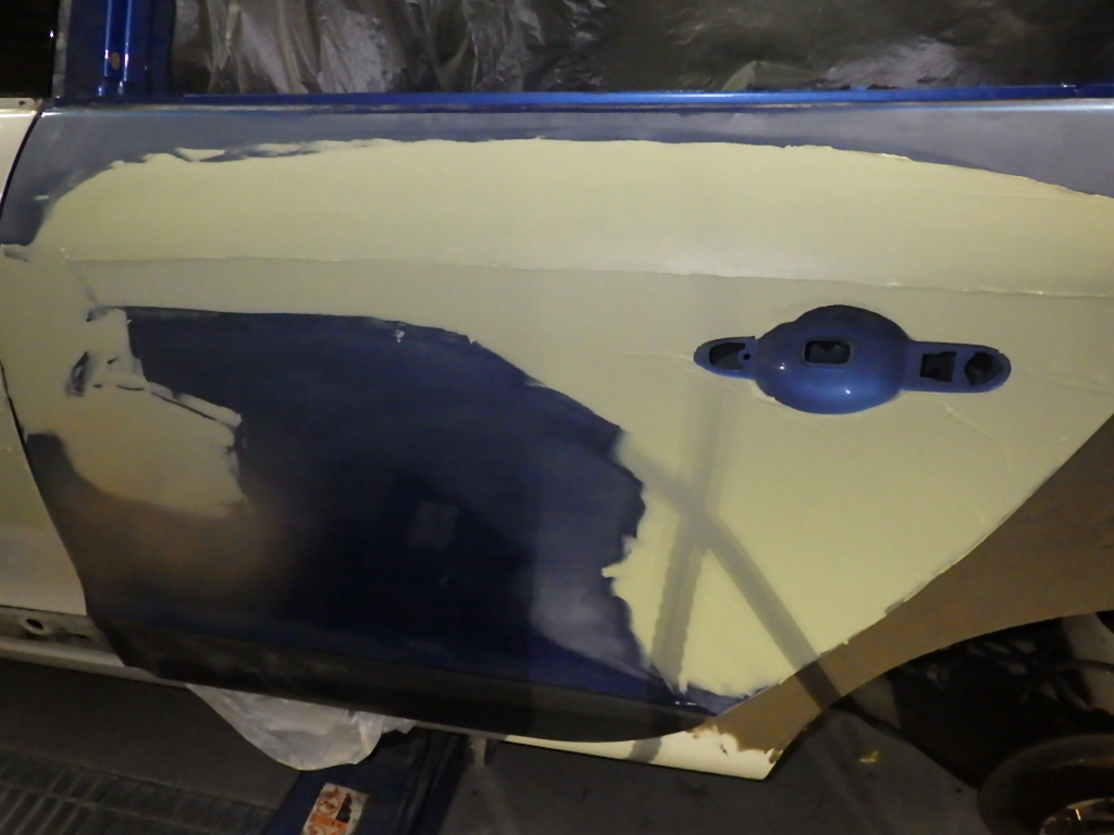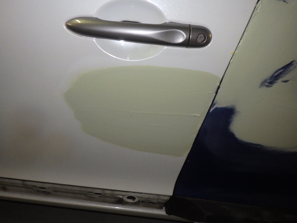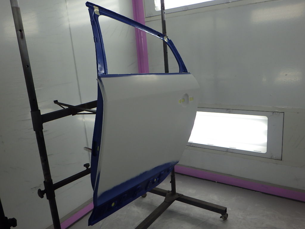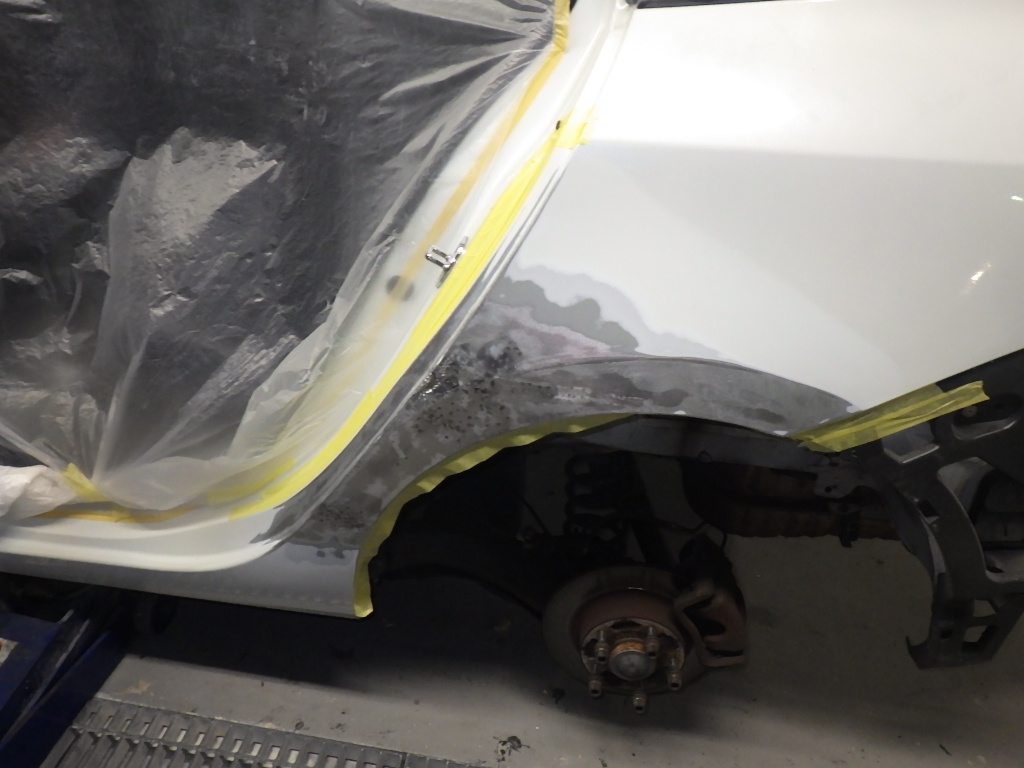 板金作業の後、脱脂作業、エアブローを行い、パテ付け作業を行いました。