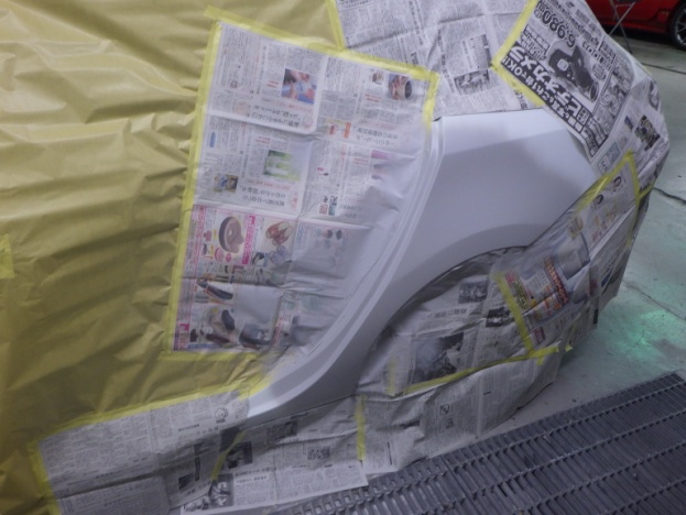 パテ乾燥の後、サンディング作業、マスキング作業、脱脂作業、エアブローを行い、