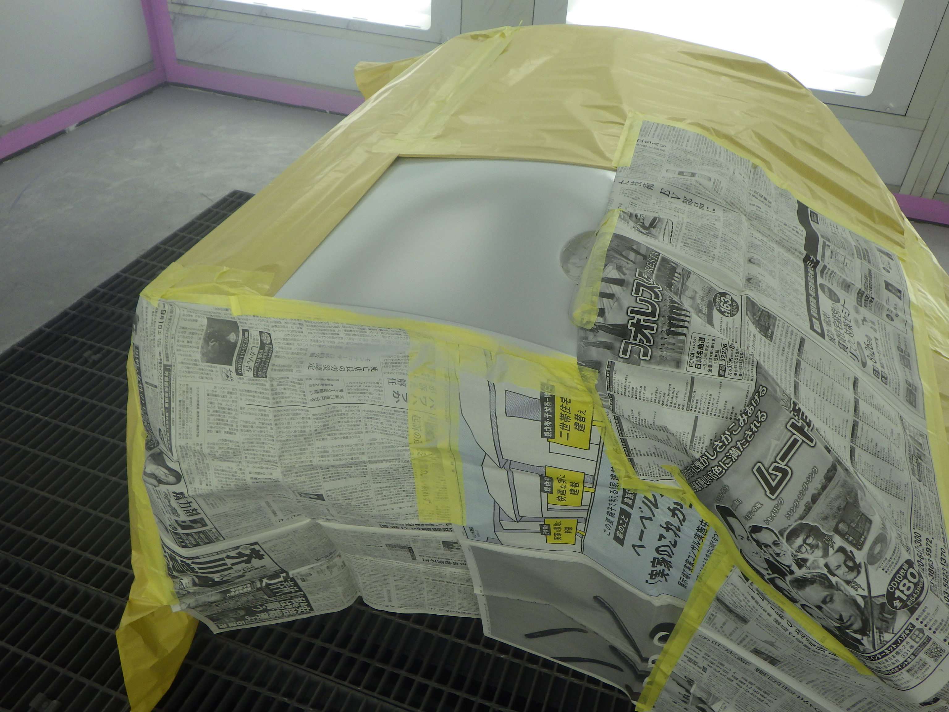 サフェーサー乾燥の後、足付け作業、マスキング作業、脱脂作業、エアブローを行い、