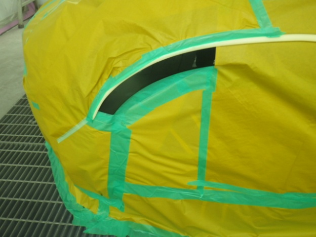 サフェーサー乾燥の後、足付け作業、マスキング作業、脱脂作業、エアブローを行い、