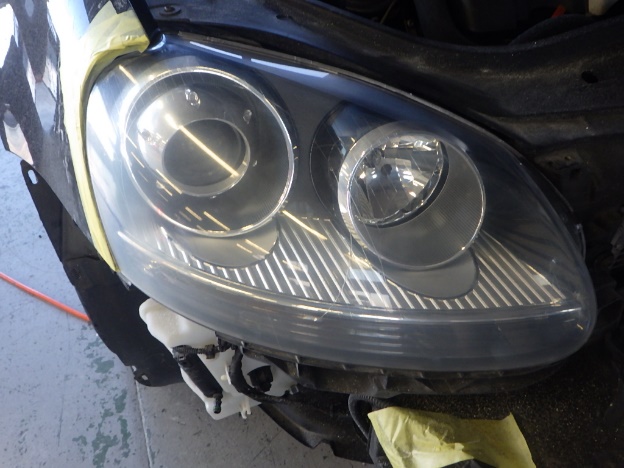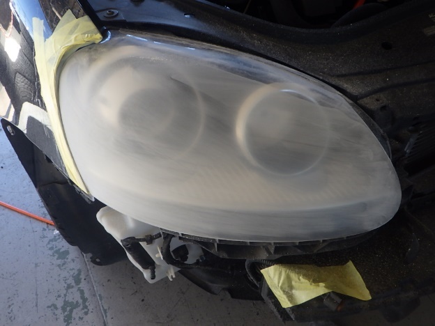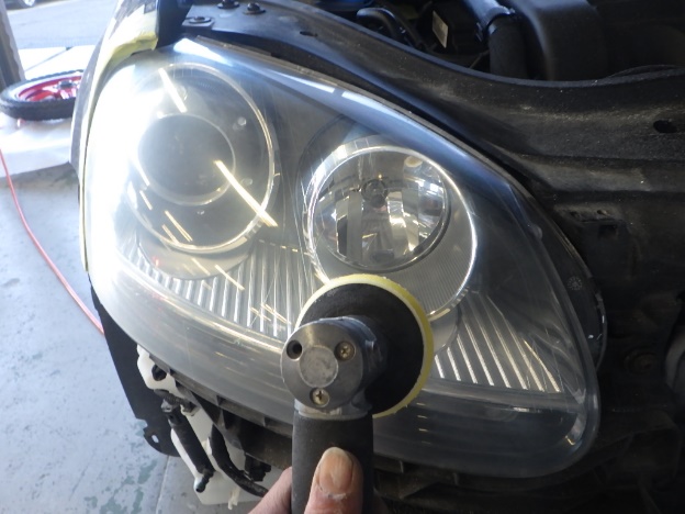 組付け作業前に、ヘッドライトの削り、磨き作業を行いました。