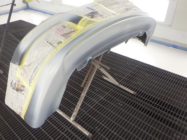 サフェーサー乾燥の後、足付け作業、脱脂作業、エアブローを行い、